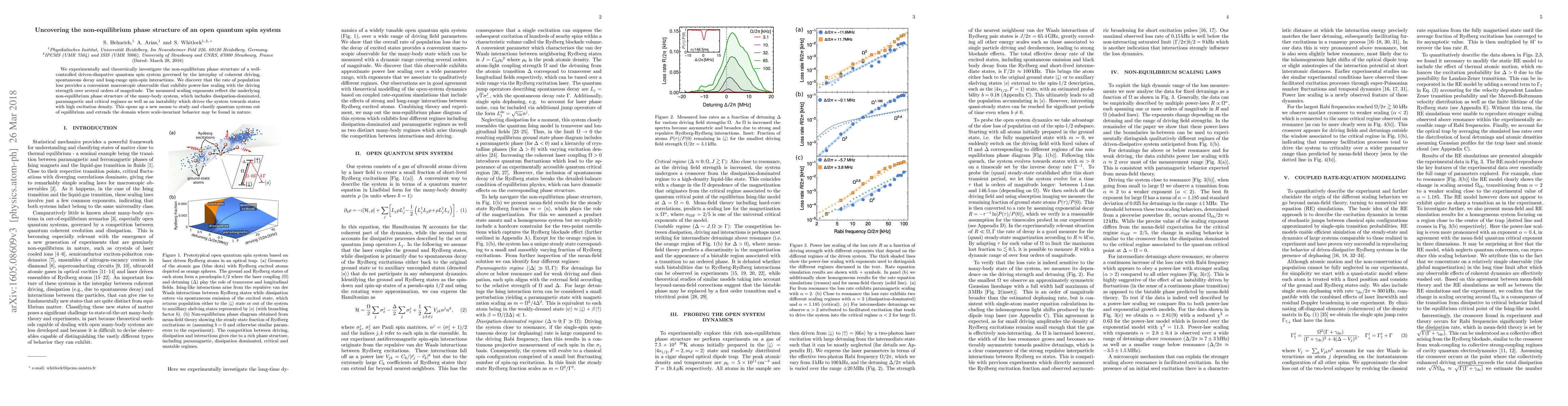 This paper explores the non-equilibrium phase structure of a driven-dissipative quantum spin system, revealing that population loss rate scales with driving strength in a power-law manner. The study identifies distinct regimes and an instability, providing a new method to classify quantum systems out of equilibrium.