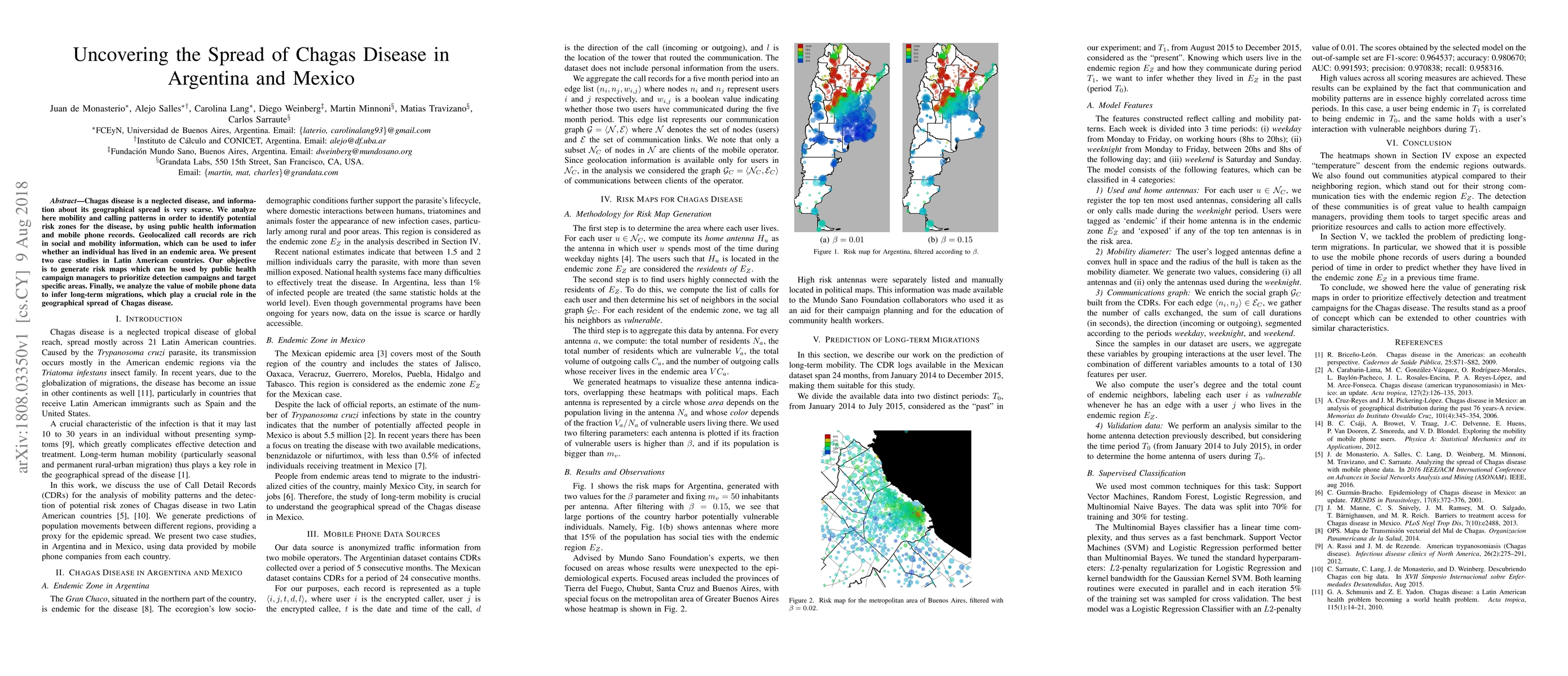 Chagas disease is a neglected disease, and information about its geographical spread is very scarse. We analyze here mobility and calling patterns in order to identify potential risk zones for the disease, by using public health information and mobile phone records. Geolocalized call records are rich in social and mobility information, which can be used to infer whether an individual has lived in an endemic area. We present two case studies in Latin American countries. Our objective is to generate risk maps which can be used by public health campaign managers to prioritize detection campaigns and target specific areas. Finally, we analyze the value of mobile phone data to infer long-term migrations, which play a crucial role in the geographical spread of Chagas disease.