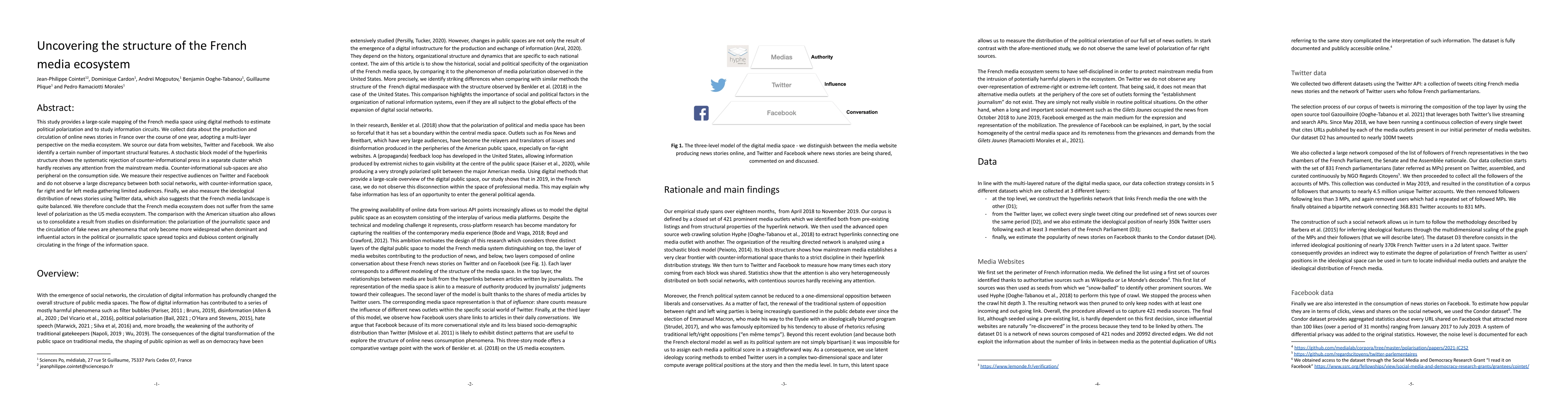 This study provides a large-scale mapping of the French media space using digital methods to estimate political polarization and to study information circuits. We collect data about the production and circulation of online news stories in France over the course of one year, adopting a multi-layer perspective on the media ecosystem. We source our data from websites, Twitter and Facebook. We also identify a certain number of important structural features. A stochastic block model of the hyperlinks structure shows the systematic rejection of counter-informational press in a separate cluster which hardly receives any attention from the mainstream media. Counter-informational sub-spaces are also peripheral on the consumption side. We measure their respective audiences on Twitter and Facebook and do not observe a large discrepancy between both social networks, with counter-information space, far right and far left media gathering limited audiences. Finally, we also measure the ideological distribution of news stories using Twitter data, which also suggests that the French media landscape is quite balanced. We therefore conclude that the French media ecosystem does not suffer from the same level of polarization as the US media ecosystem. The comparison with the American situation also allows us to consolidate a result from studies on disinformation: the polarization of the journalistic space and the circulation of fake news are phenomena that only become more widespread when dominant and influential actors in the political or journalistic space spread topics and dubious content originally circulating in the fringe of the information space.