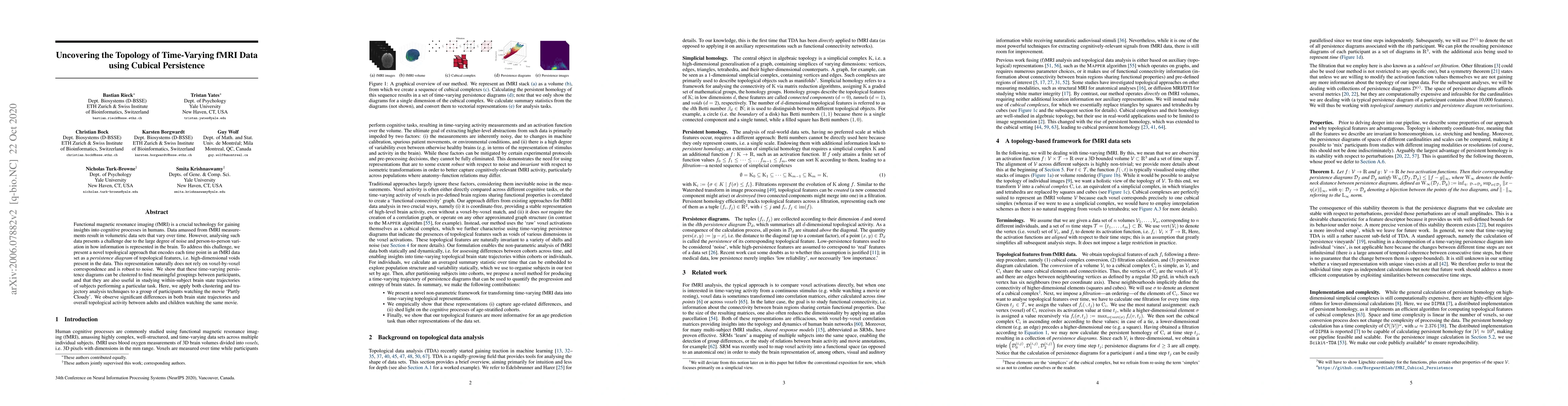 Functional magnetic resonance imaging (fMRI) is a crucial technology for gaining insights into cognitive processes in humans. Data amassed from fMRI measurements result in volumetric data sets that vary over time. However, analysing such data presents a challenge due to the large degree of noise and person-to-person variation in how information is represented in the brain. To address this challenge, we present a novel topological approach that encodes each time point in an fMRI data set as a persistence diagram of topological features, i.e. high-dimensional voids present in the data. This representation naturally does not rely on voxel-by-voxel correspondence and is robust to noise. We show that these time-varying persistence diagrams can be clustered to find meaningful groupings between participants, and that they are also useful in studying within-subject brain state trajectories of subjects performing a particular task. Here, we apply both clustering and trajectory analysis techniques to a group of participants watching the movie 'Partly Cloudy'. We observe significant differences in both brain state trajectories and overall topological activity between adults and children watching the same movie.