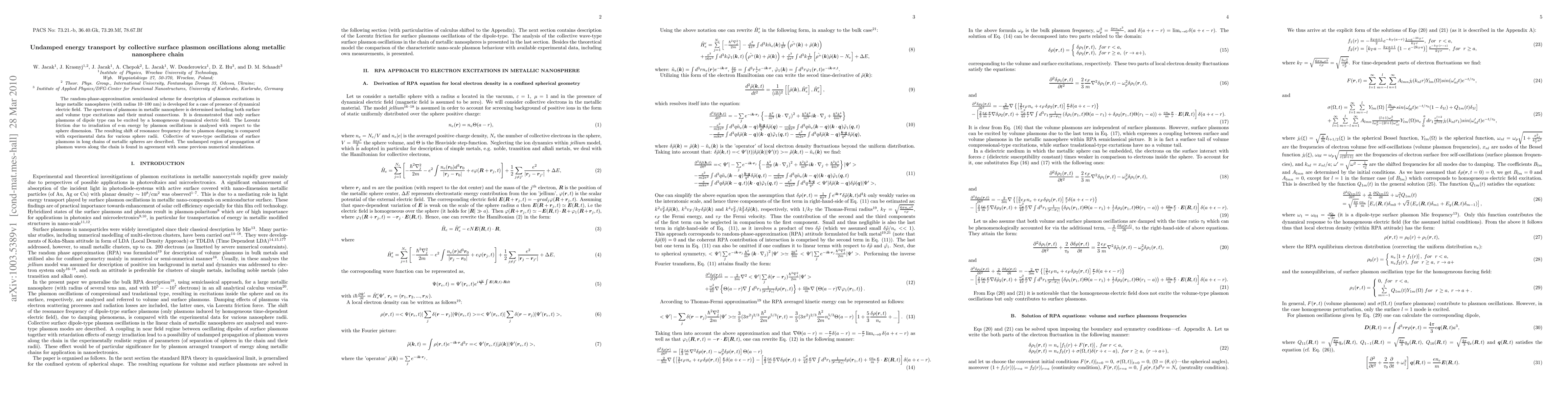 This paper develops a theoretical framework to describe surface plasmon excitations in metallic nanospheres using the random-phase-approximation. It finds that dipole surface plasmons can be excited by a dynamical electric field, and identifies an undamped region for the propagation of plasmon waves along chains of metallic nanospheres, consistent with previous numerical simulations.