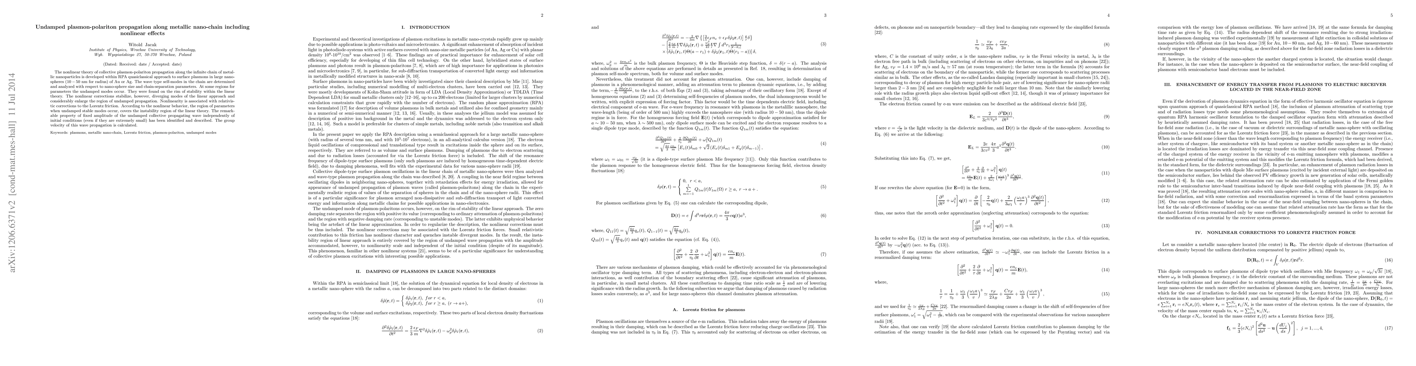 This paper develops a nonlinear theory for undamped plasmon-polariton propagation along metallic nano-chains, showing that nonlinear effects stabilize previously unstable modes and significantly expand the region for undamped wave propagation. The study identifies fixed amplitude propagation and calculates the group velocity of these stable waves.