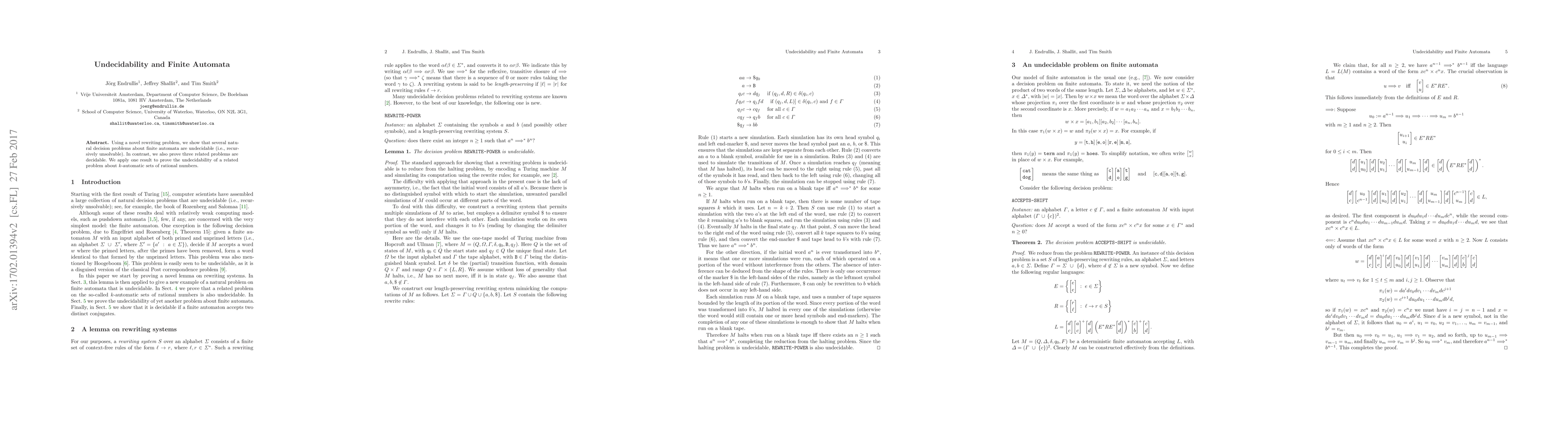 This research proves certain finite automata decision problems are undecidable using a unique rewriting problem, while three related problems are decidable. The findings also demonstrate the undecidability of a k-automatic sets problem for rational numbers.