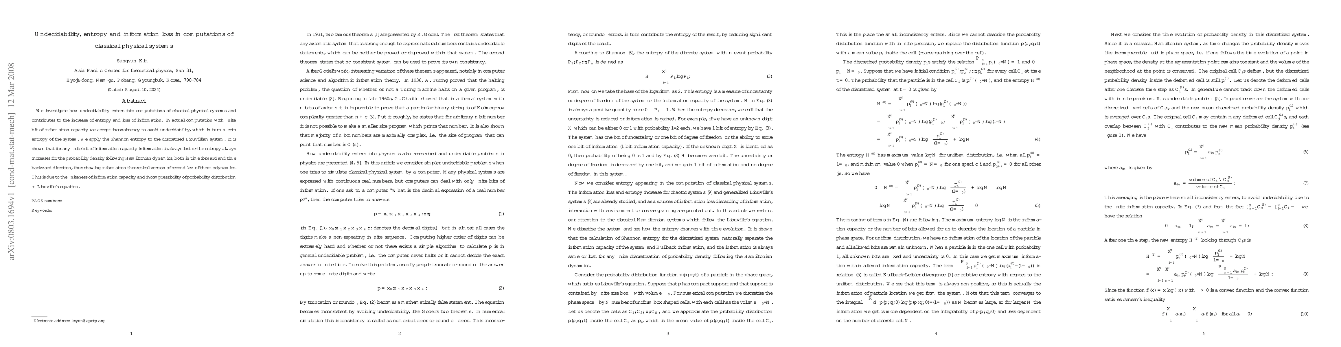 We investigate how undecidability enters into computations of classical physical systems and contributes to the increase of entropy and loss of information. In actual computation with finite bit of information capacity we accept inconsistency to avoid undecidability, which in turn affects entropy of the system. We apply the Shannon entropy to the discretized Liouvillian system. It is shown that for any finite bit of information capacity information is always lost or the entropy always increases for the probability density following Hamiltonian dynamics, both in time forward and time backward direction, thus showing information theoretical version of second law of thermodynamics. This is due to the finiteness of information capacity and incompressibility of probability distribution in Liouville's equation.