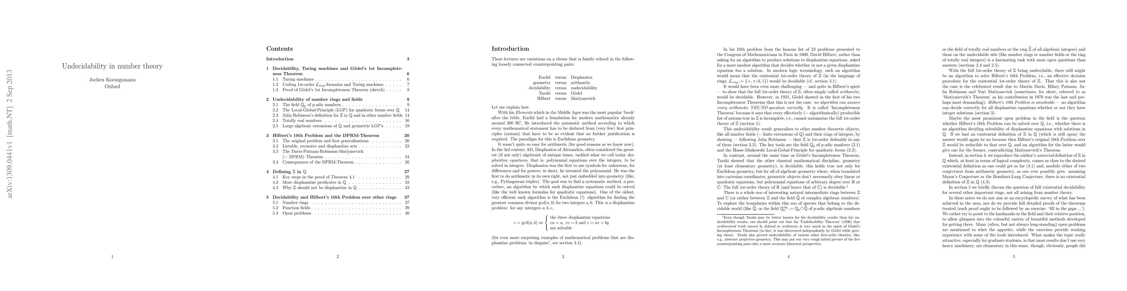 This paper explores undecidability in number theory, including Hilbert's 10th problem and a proof that integers are universally definable in the rationals.