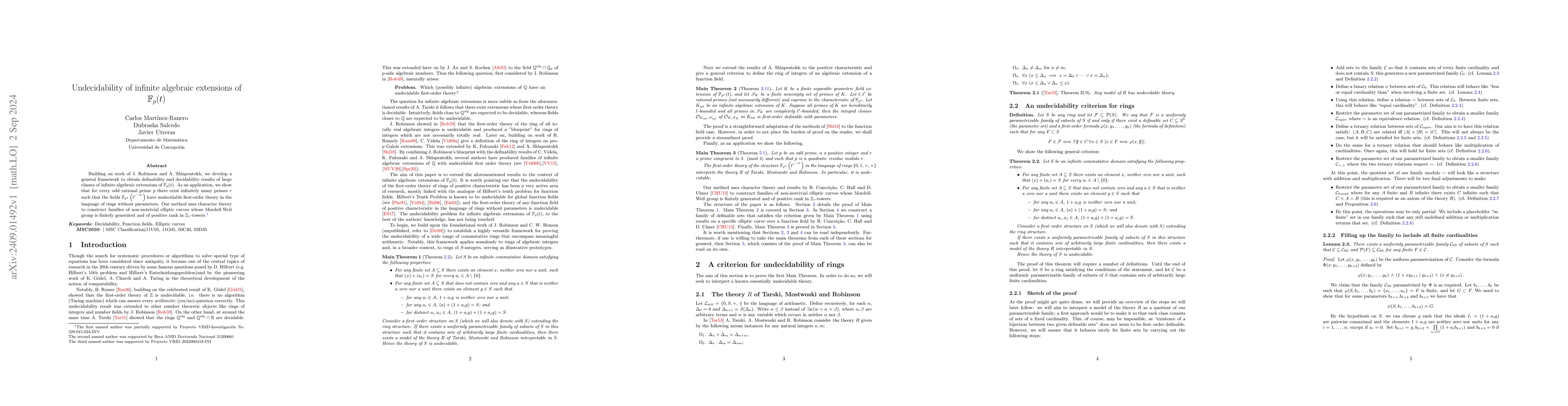 This paper establishes a framework for proving the undecidability of first-order theories in infinite algebraic extensions of $\mathbb{F}_p(t)$, leveraging character theory and elliptic curves. It demonstrates that for any odd prime $p$, there are infinitely many primes $r$ where certain fields have undecidable first-order theory.