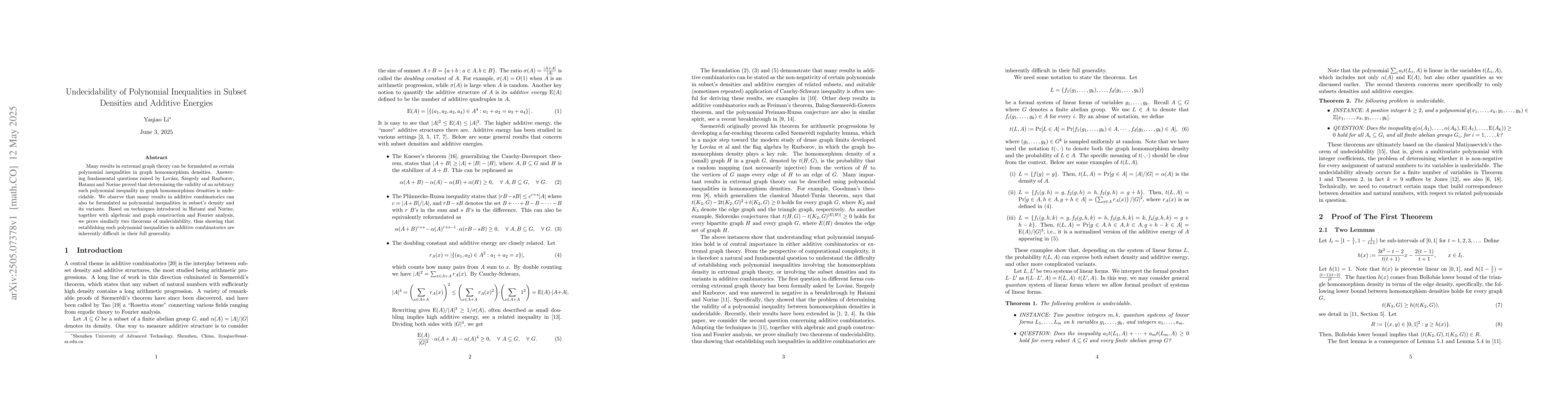 Determining polynomial inequalities in subset densities and additive energies is undecidable, making it impossible to solve certain problems in extremal graph theory and additive combinatorics.