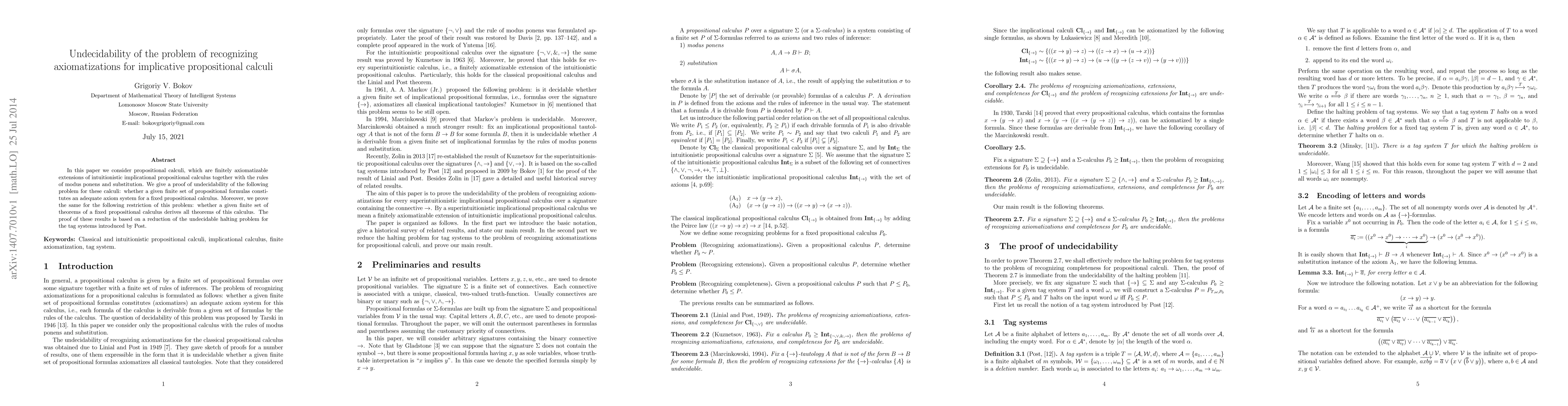 In this paper we consider propositional calculi, which are finitely axiomatizable extensions of intuitionistic implicational propositional calculus together with the rules of modus ponens and substitution. We give a proof of undecidability of the following problem for these calculi: whether a given finite set of propositional formulas constitutes an adequate axiom system for a fixed propositional calculus. Moreover, we prove the same for the following restriction of this problem: whether a given finite set of theorems of a fixed propositional calculus derives all theorems of this calculus. The proof of these results is based on a reduction of the undecidable halting problem for the tag systems introduced by Post.