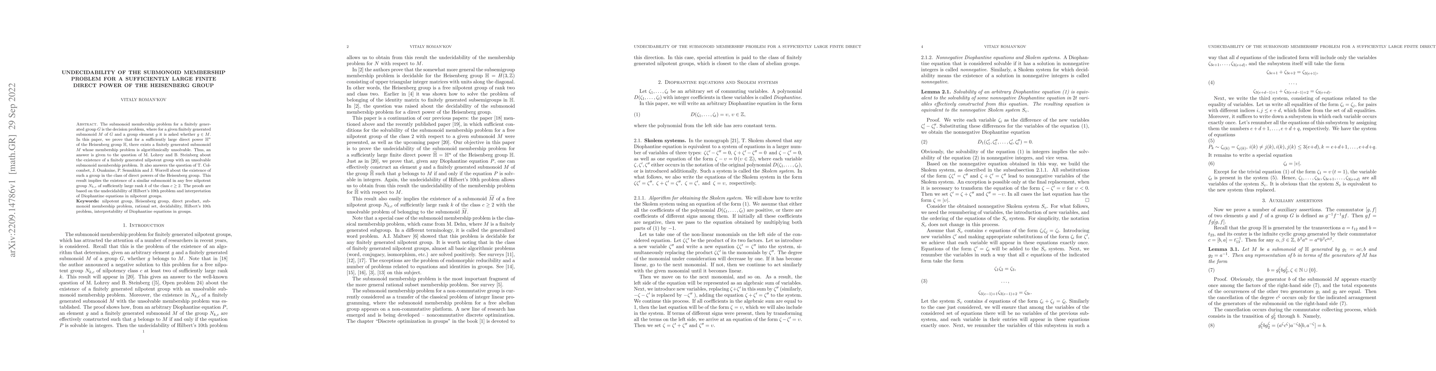 This paper proves the undecidability of the submonoid membership problem for sufficiently large direct powers of the Heisenberg group, answering questions posed by Lohrey, Steinberg, and others regarding the existence of such groups. The proofs leverage undecidability results from Hilbert's 10th problem and Diophantine equations in nilpotent groups.