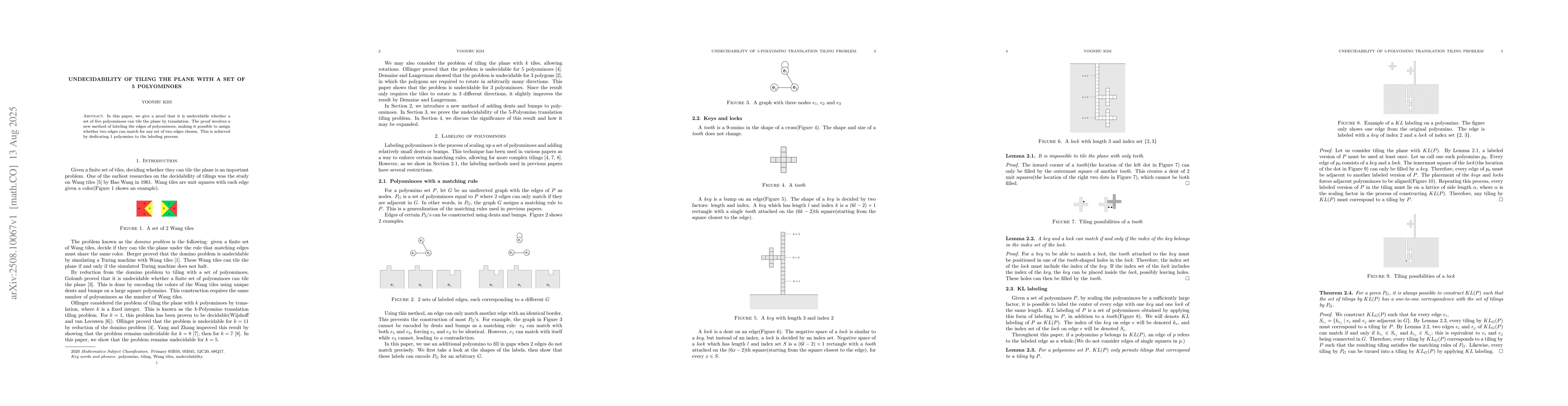 In this paper, we give a proof that it is undecidable whether a set of five polyominoes can tile the plane by translation. The proof involves a new method of labeling the edges of polyominoes, making it possible to assign whether two edges can match for any set of two edges chosen. This is achieved by dedicating 1 polyomino to the labeling process.