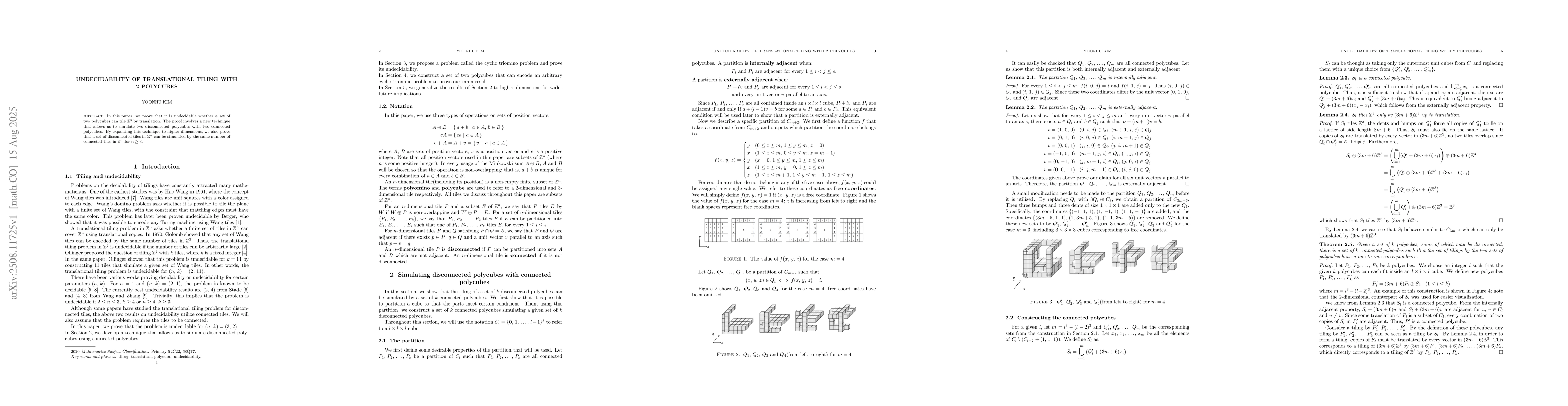 In this paper, we prove that it is undecidable whether a set of two polycubes can tile $\mathbb{Z}^3$ by translation. The proof involves a new technique that allows us to simulate two disconnected polycubes with two connected polycubes. By expanding this technique to higher dimensions, we also prove that a set of disconnected tiles in $\mathbb{Z}^n$ can be simulated by the same number of connected tiles in $\mathbb{Z}^n$ for $n \geq 3$.