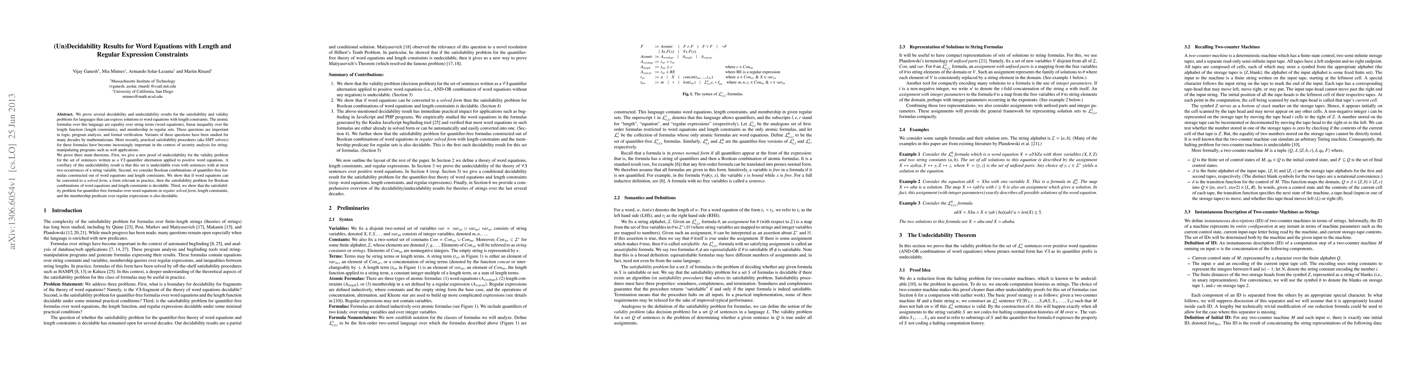We prove several decidability and undecidability results for the satisfiability and validity problems for languages that can express solutions to word equations with length constraints. The atomic formulas over this language are equality over string terms (word equations), linear inequality over the length function (length constraints), and membership in regular sets. These questions are important in logic, program analysis, and formal verification. Variants of these questions have been studied for many decades by mathematicians. More recently, practical satisfiability procedures (aka SMT solvers) for these formulas have become increasingly important in the context of security analysis for string-manipulating programs such as web applications. We prove three main theorems. First, we give a new proof of undecidability for the validity problem for the set of sentences written as a forall-exists quantifier alternation applied to positive word equations. A corollary of this undecidability result is that this set is undecidable even with sentences with at most two occurrences of a string variable. Second, we consider Boolean combinations of quantifier-free formulas constructed out of word equations and length constraints. We show that if word equations can be converted to a solved form, a form relevant in practice, then the satisfiability problem for Boolean combinations of word equations and length constraints is decidable. Third, we show that the satisfiability problem for quantifier-free formulas over word equations in regular solved form, length constraints, and the membership predicate over regular expressions is also decidable.