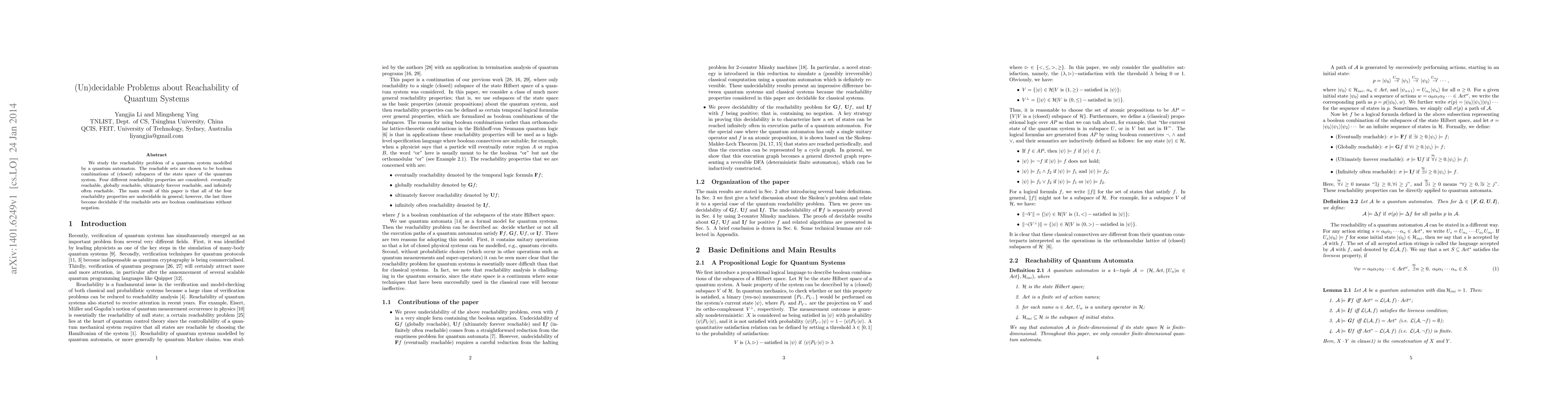 This paper investigates the reachability problem in quantum systems modeled by quantum automata, showing that all four considered reachability properties are undecidable in general. However, three of these properties become decidable when reachable sets exclude negation in their boolean combinations.