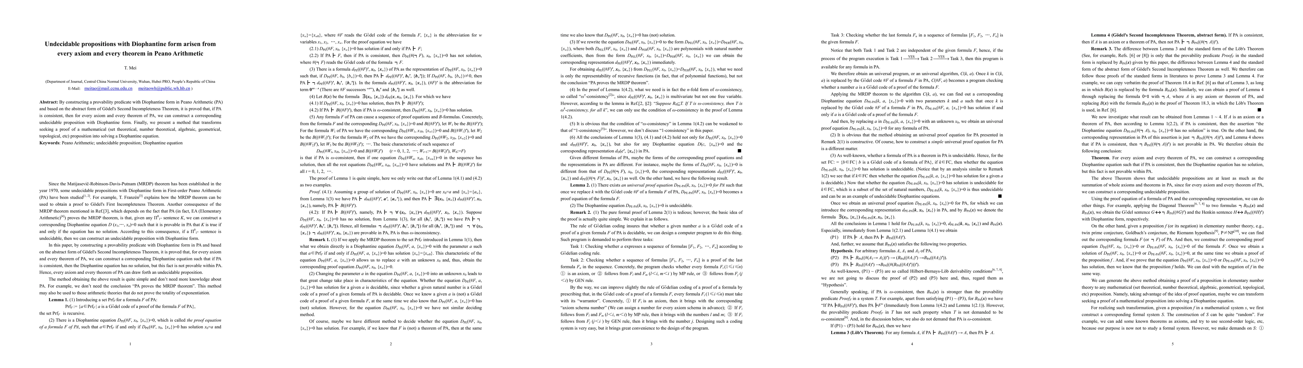 Based on the MRDP theorem, we introduce the ideas of the proof equation of a formula and universal proof equation of Peano Arithmetic (PA); and then, combining universal proof equation and G\"odel's Second Incompleteness Theorem, it is proved that, if PA is consistent, then for every axiom and every theorem of PA, we can construct a corresponding undecidable proposition with Diophantine form. Finally, we present an approach that transforms seeking a proof of a mathematical (set theoretical, number theoretical, algebraic, geometrical, topological, etc) proposition into solving a Diophantine equation.