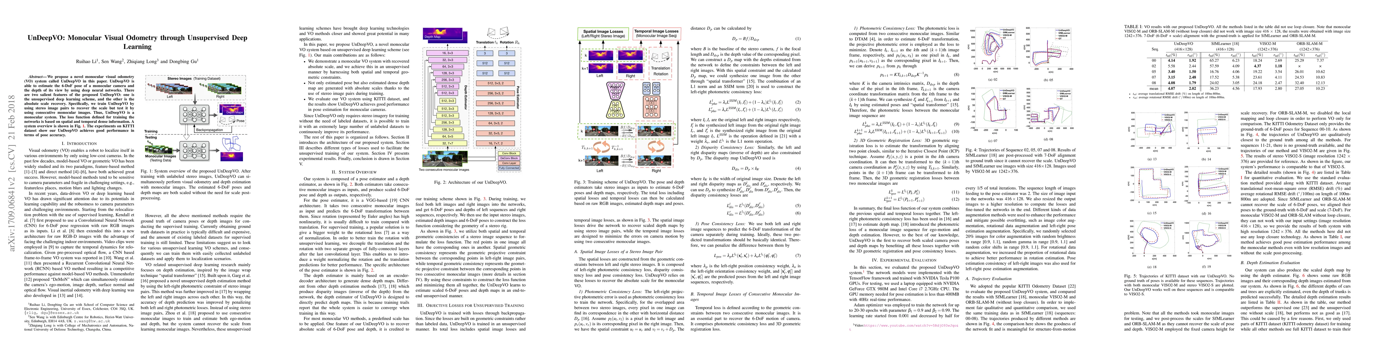 UnDeepVO is a novel monocular visual odometry system that estimates 6-DoF pose and depth using unsupervised deep learning. It achieves absolute scale recovery through training on stereo pairs and operates effectively on monocular images.