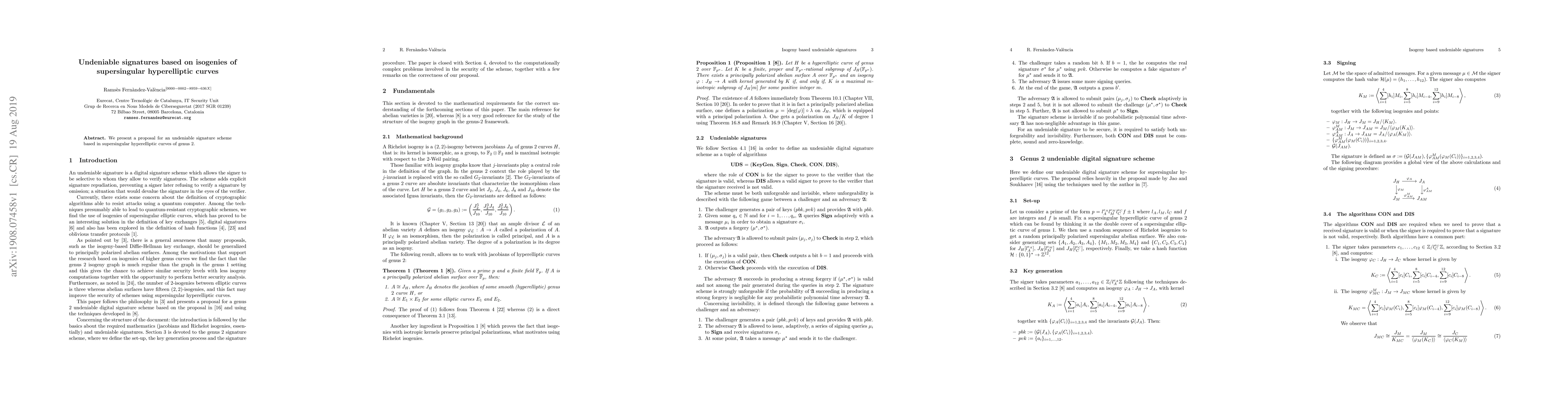 Summary: This paper proposes an undeniable signature scheme utilizing the mathematical properties of isogenies in supersingular hyperelliptic curves of genus 2, offering a novel approach to cryptographic security. The scheme aims to provide a robust method for ensuring the authenticity and non-repudiation of digital signatures.