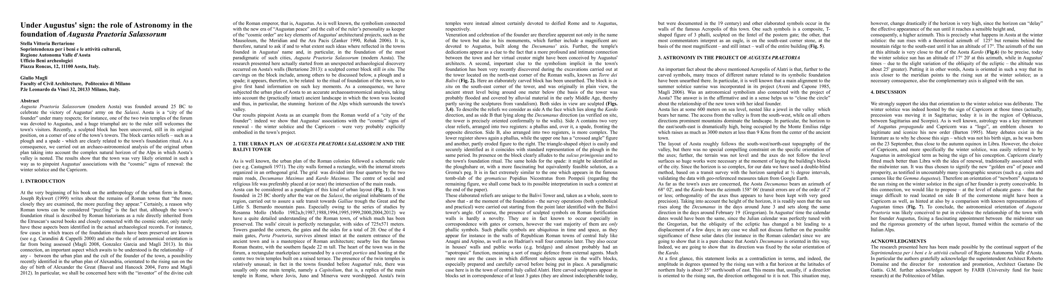 Augusta Praetoria Salassorum, modern Aosta, was founded around 25 BC to celebrate the victory of Augustus army on the Salassi. Aosta is a city of the founder under many respects; for instance, one of the two twin temples of the forum was devoted to Augustus, and a huge triumphal arc to the ruler still welcomes the town visitors. Recently, a sculpted block has been uncovered, still in its original position, on a corner of one of the town towers. The block carries reliefs, such as a plough and a spade, which are clearly related to the town foundation ritual. As a consequence, we carried out an archaeoastronomical analysis of the original urban plan taking into account the complex natural horizon of the Alps in which Aosta valley is nested. The results show that the town was very likely oriented in such a way as to pinpoint Augustus associations with the cosmic signs of renewal: the winter solstice and the Capricorn.