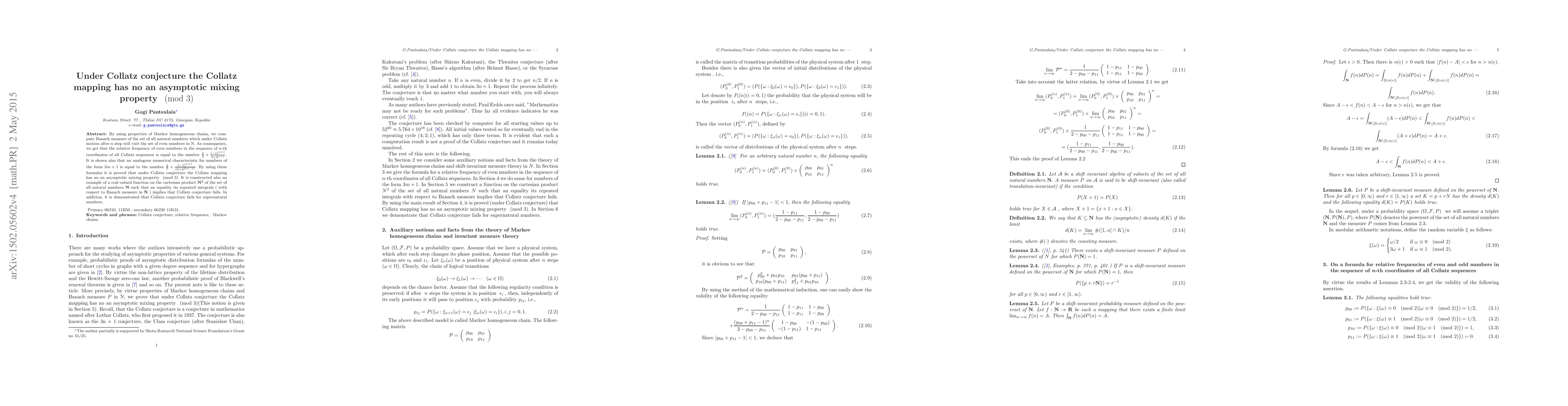 By using properties of Markov homogeneous chains and Banach measure in $\mathrm{N}$, it is proved that a relative frequency of even numbers in the sequence of $n$-th coordinates of all Collatz sequences is equal to the number $\frac{2}{3}+\frac{(-1)^{n+1}}{3\times 2^{n+1}}.$ It is shown also that an analogous numerical characteristic for numbers of the form $3m+1$ is equal to the number $\frac{3}{5}+ \frac{(-1)^{n+1}}{15 \times 2^{2(n-1)}}. $ By using these formulas it is proved that under Collatz conjecture the Collatz mapping has no an asymptotic mixing property $\pmod{3}$. It is constructed also an example of a real-valued function on the cartesian product $N^2$ of the set of all natural numbers $N$ such that an equality its repeated integrals (with respect to Banach measure in $N$) implies that Collatz conjecture fails. In addition, it is demonstrated that Collatz conjecture fails for supernatural numbers.