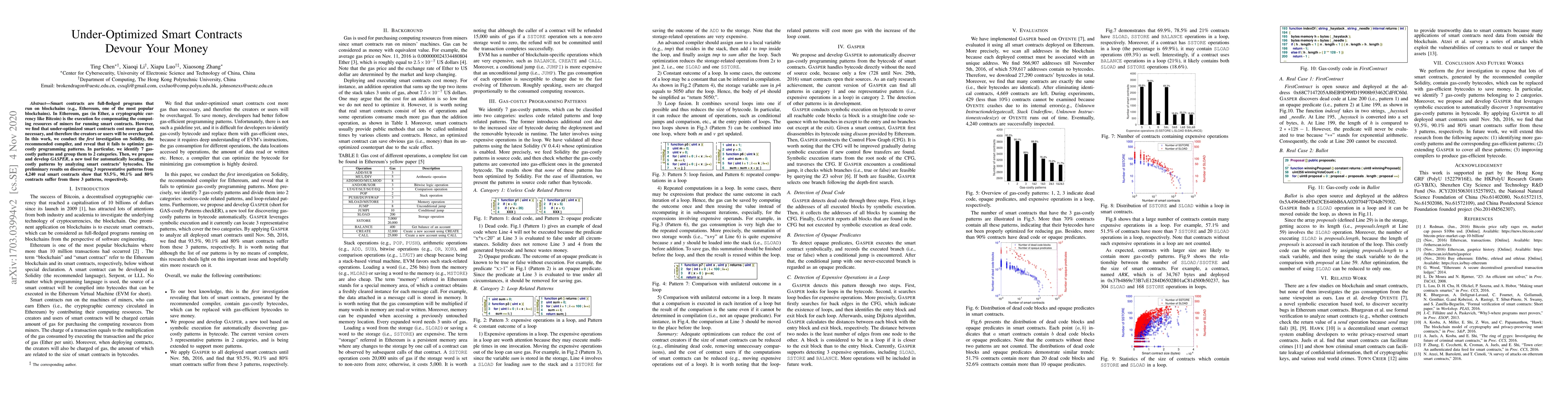 Smart contracts are full-fledged programs that run on blockchains (e.g., Ethereum, one of the most popular blockchains). In Ethereum, gas (in Ether, a cryptographic currency like Bitcoin) is the execution fee compensating the computing resources of miners for running smart contracts. However, we find that under-optimized smart contracts cost more gas than necessary, and therefore the creators or users will be overcharged. In this work, we conduct the first investigation on Solidity, the recommended compiler, and reveal that it fails to optimize gas-costly programming patterns. In particular, we identify 7 gas-costly patterns and group them to 2 categories. Then, we propose and develop GASPER, a new tool for automatically locating gas-costly patterns by analyzing smart contracts' bytecodes. The preliminary results on discovering 3 representative patterns from 4,240 real smart contracts show that 93.5%, 90.1% and 80% contracts suffer from these 3 patterns, respectively.