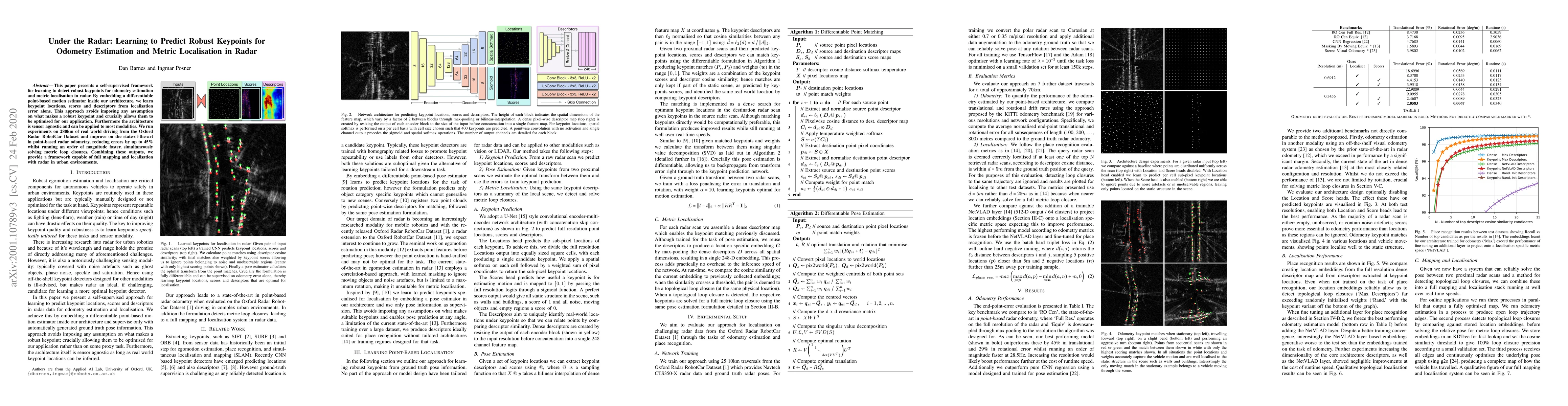 This paper presents a self-supervised framework for learning to detect robust keypoints for odometry estimation and metric localisation in radar. By embedding a differentiable point-based motion estimator inside our architecture, we learn keypoint locations, scores and descriptors from localisation error alone. This approach avoids imposing any assumption on what makes a robust keypoint and crucially allows them to be optimised for our application. Furthermore the architecture is sensor agnostic and can be applied to most modalities. We run experiments on 280km of real world driving from the Oxford Radar RobotCar Dataset and improve on the state-of-the-art in point-based radar odometry, reducing errors by up to 45% whilst running an order of magnitude faster, simultaneously solving metric loop closures. Combining these outputs, we provide a framework capable of full mapping and localisation with radar in urban environments.