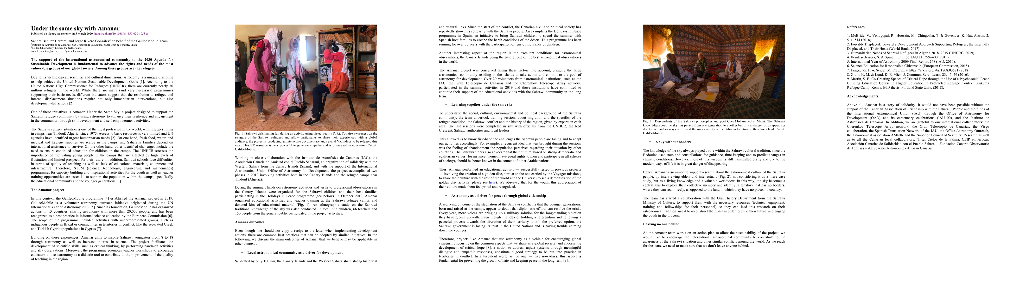 Due to its technological, scientific and cultural dimensions, astronomy is a unique discipline to help achieve the United Nations Sustainable Development Goals. According to the United Nations High Commissioner for Refugees (UNHCR), there are currently nearly 30 million refugees in the world. While there are many (and very necessary) programmes supporting their basic needs, different indicators suggest that the resolution to refugee and internal displacement situations require not only humanitarian interventions, but also development-led actions. One of these initiatives is Amanar: Under the Same Sky, a project designed to support the Sahrawi refugee community by using astronomy to enhance their resilience and engagement in the community, through skill development and self-empowerment activities.