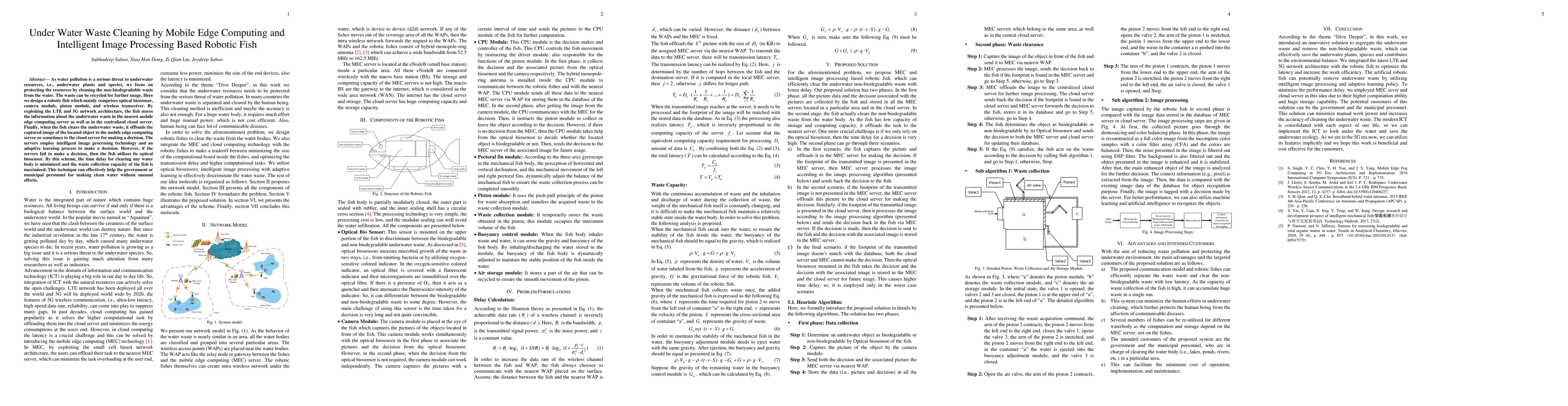 This paper proposes a robotic fish equipped with sensors and a camera to clean non-biodegradable waste underwater using mobile edge computing and intelligent image processing. The fish utilizes LTE/5G networks to store waste data and offload images to servers for decision-making, minimizing time delay and maximizing waste collection efficiency.