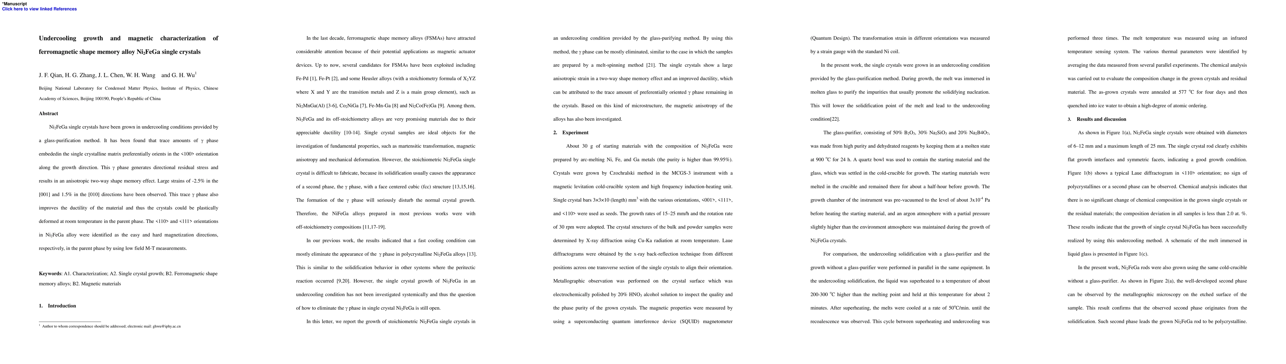Ni2FeGa single crystals, grown under specific cooling conditions, exhibit a trace gamma phase oriented in <100> along growth, causing anisotropic shape memory effect and large strains. This phase also enhances ductility, enabling room-temperature deformation. Magnetization easy and hard directions identified as <110> and <111> respectively.