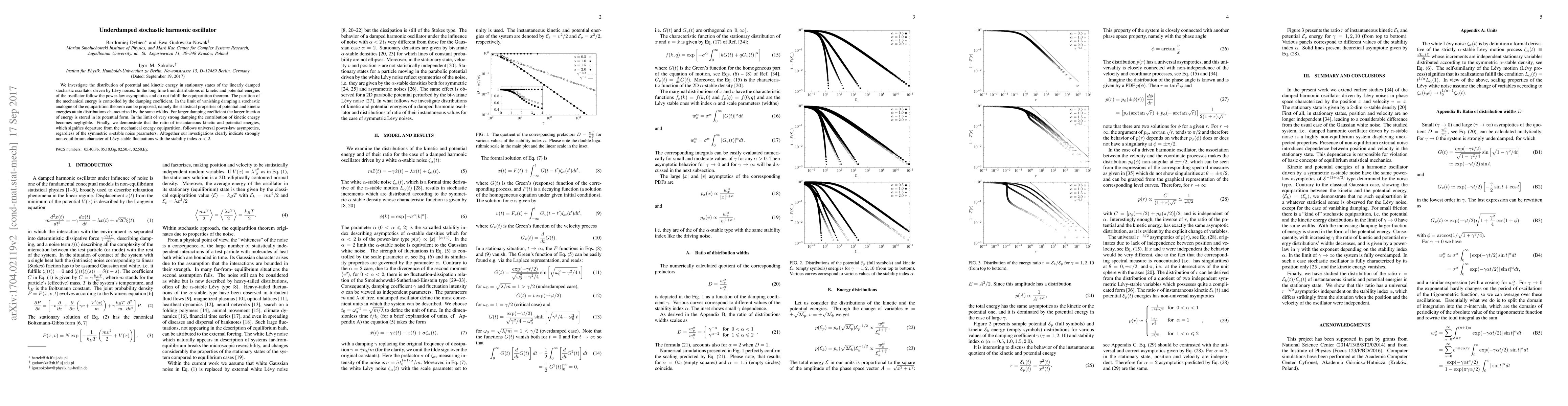 We investigate stationary states of the linear damped stochastic oscillator driven by L\'evy noises. In the long time limit kinetic and potential energies of the oscillator do not fulfill the equipartition theorem and their distributions follow the power-law asymptotics. At the same time, partition of the mechanical energy is controlled by the damping coefficient. We show that in the limit of vanishing damping a stochastic analogue of the equipartition theorem can be proposed, namely the statistical properties of potential and kinetic energies attain distributions characterized by the same width. Finally, we demonstrate that the ratio of instantaneous kinetic and potential energies which signifies departure from the mechanical energy equipartition, follows universal power-law asymptotics.
