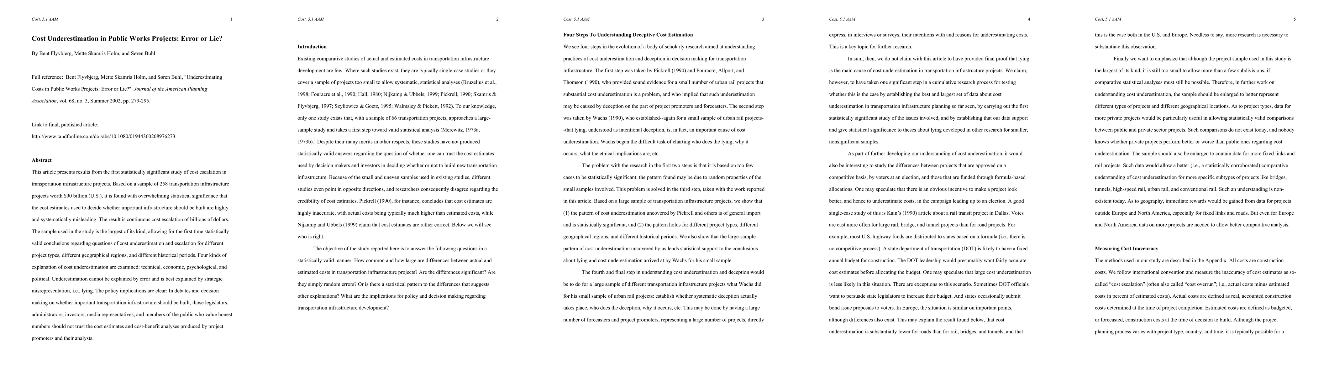 This study reveals that cost estimates for transportation infrastructure projects are systematically misleading, suggesting strategic misrepresentation rather than error. Policymakers and the public should be wary of cost estimates provided by project promoters.