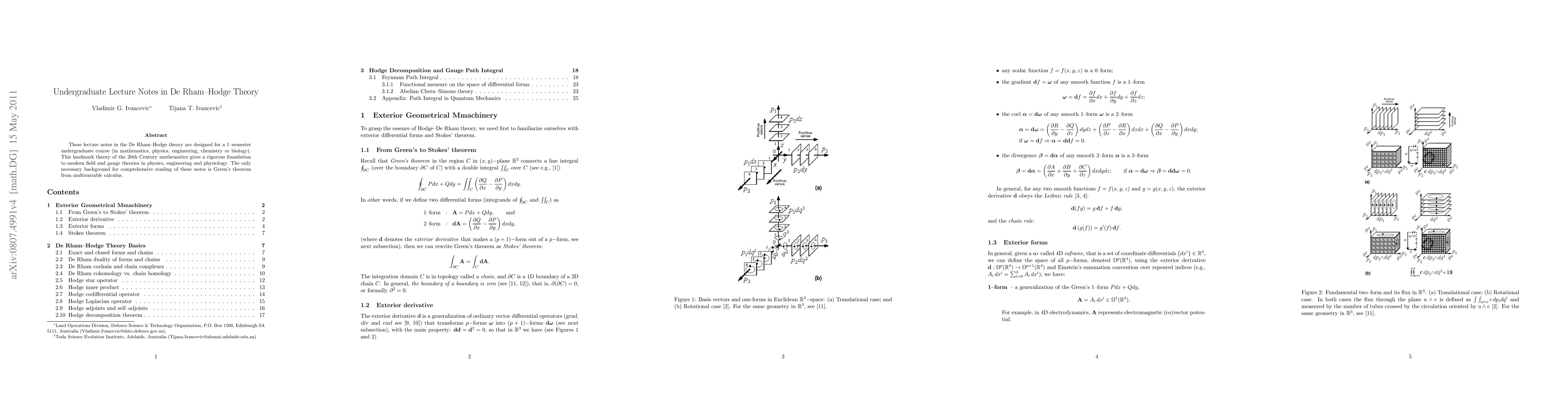 These lecture notes in the De Rham-Hodge theory are designed for a 1-semester undergraduate course (in mathematics, physics, engineering, chemistry or biology). This landmark theory of the 20th Century mathematics gives a rigorous foundation to modern field and gauge theories in physics, engineering and physiology. The only necessary background for comprehensive reading of these notes is Green's theorem from multivariable calculus.