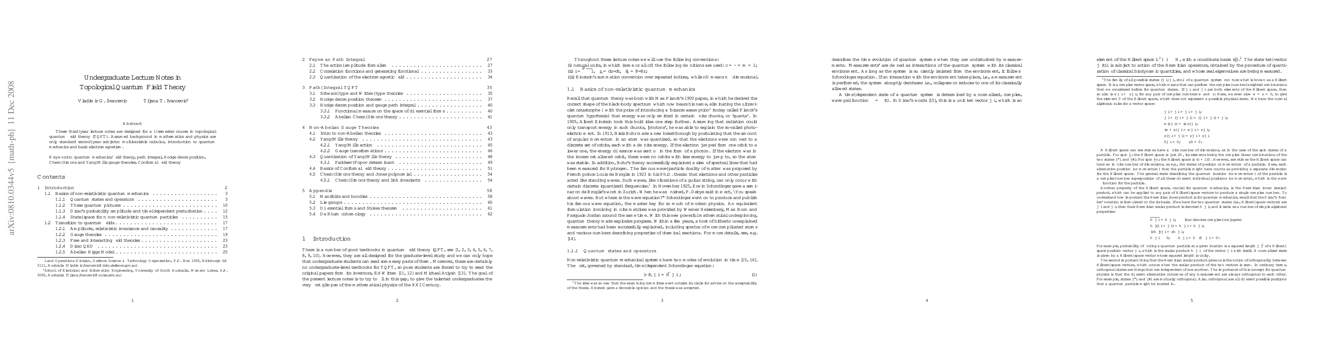 These lecture notes provide an introduction to topological quantum field theory (TQFT) suitable for third-year students, assuming foundational knowledge in multivariable calculus, quantum mechanics, and basic electromagnetism. Topics include path integrals, Hodge decomposition, and gauge theories like Chern-Simons and Yang-Mills.