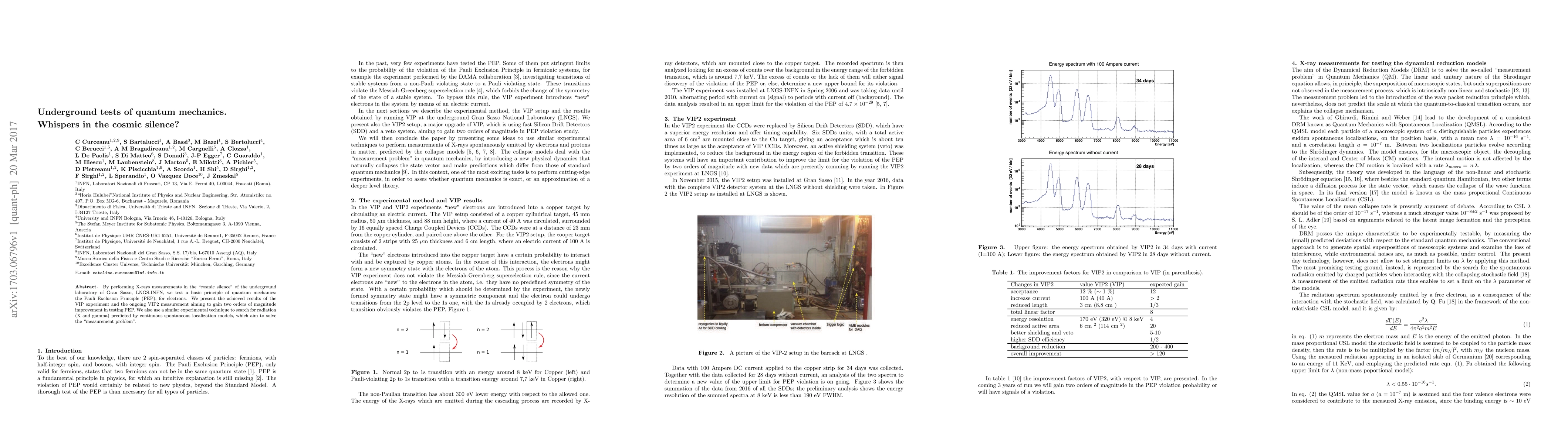 By performing X-rays measurements in the "cosmic silence" of the underground laboratory of Gran Sasso, LNGS-INFN, we test a basic principle of quantum mechanics: the Pauli Exclusion Principle (PEP), for electrons. We present the achieved results of the VIP experiment and the ongoing VIP2 measurement aiming to gain two orders of magnitude improvement in testing PEP. We also use a similar experimental technique to search for radiation (X and gamma) predicted by continuous spontaneous localization models, which aim to solve the "measurement problem".