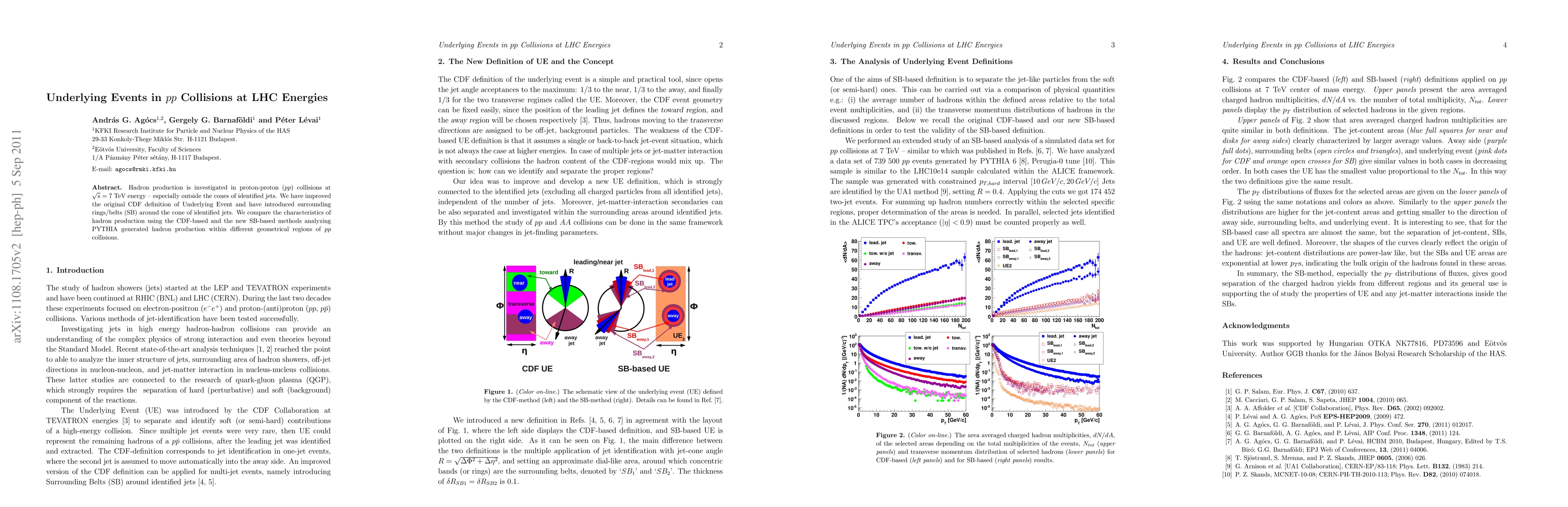 Hadron production is investigated in proton-proton (pp) collisions at \surds = 7 TeV LHC energy - especially outside the cones of identified jets. We improved the original CDF definition of underlying event and introduce surrounding rings/belts (SB) around the cone of identified jets. We compare the characteristics of hadron production using the original CDF-based and the new SB-based via analysing PYTHIA generated fluxes of these hadrons within the geometrical regions of pp collisions.