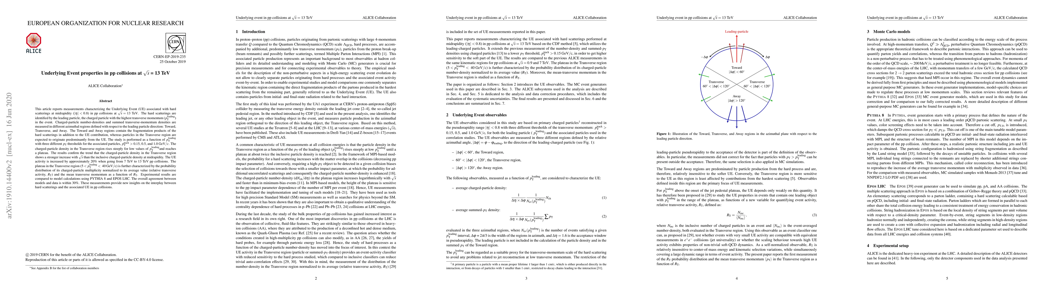 This article reports measurements characterizing the Underlying Event (UE) associated with hard scatterings at midrapidity in pp collisions at $\sqrt{s}=13$ TeV. The hard scatterings are identified by the leading particle, the charged particle with the highest transverse momentum ($p_{\rm T}^{\rm leading}$) in the event. Charged-particle number and summed transverse-momentum densities are measured in different azimuthal regions defined with respect to the leading particle direction: Toward, Transverse, and Away. The Toward and Away regions contain the fragmentation products of the hard scatterings in addition to the UE contribution, whereas particles in the Transverse region are expected to originate predominantly from the UE. The study is performed as a function of $p_{\rm T}^{\rm leading}$ with three different $p_{\rm T}$ thresholds for the associated particles, $p_{\rm T}^{\rm min} >$ 0.15, 0.5, and 1.0 GeV/$c$. The charged-particle density in the Transverse region rises steeply for low values of $p_{\rm T}^{\rm leading}$ and reaches a plateau. The results confirm the trend that the charged-particle density in the Transverse region shows a stronger increase with $\sqrt{s}$ than the inclusive charged-particle density at midrapidity. The UE activity is increased by approximately 20% when going from 7 to 13 TeV. The plateau in the Transverse region ($5 < p_{\rm T}^{\rm leading} < ~ 40$ GeV/$c$ ) is further characterized by the probability distribution of its charged-particle multiplicity normalized to its average value (relative transverse activity, $R_{T}$) and the mean transverse momentum as a function of $R_{T}$. Experimental results are compared to model calculations using PYTHIA 8 and EPOS LHC. The overall agreement between models and data is within 30%. These measurements provide new insights on the interplay between hard scatterings and the associated UE in pp collisions.