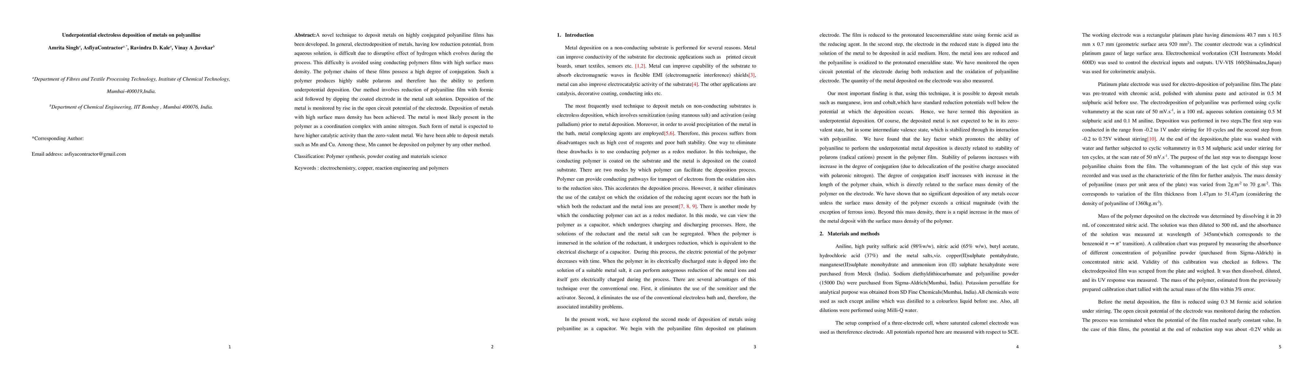A novel technique to deposit metals on highly conjugated polyaniline films has been developed. In general, electrodeposition of metals, having low reduction potential, from aqueous solution, is difficult due to disruptive effect of hydrogen which evolves during the process. This difficulty is avoided using conducting polymers films with high surface mass density. The polymer chains of these films possess a high degree of conjugation. Such a polymer produces highly stable polarons and therefore has the ability to perform underpotential deposition. Our method involves reduction of polyaniline film with formic acid followed by dipping the coated electrode in the metal salt solution. Deposition of the metal is monitored by rise in the open circuit potential of the electrode. Deposition of metals with high surface mass density has been achieved. The metal is most likely present in the polymer as a coordination complex with amine nitrogen. Such form of metal is expected to have higher catalytic activity than the zero-valent metal. We have been able to deposit metals such as Mn and Cu. Among these, Mn cannot be deposited on polymer by any other method.