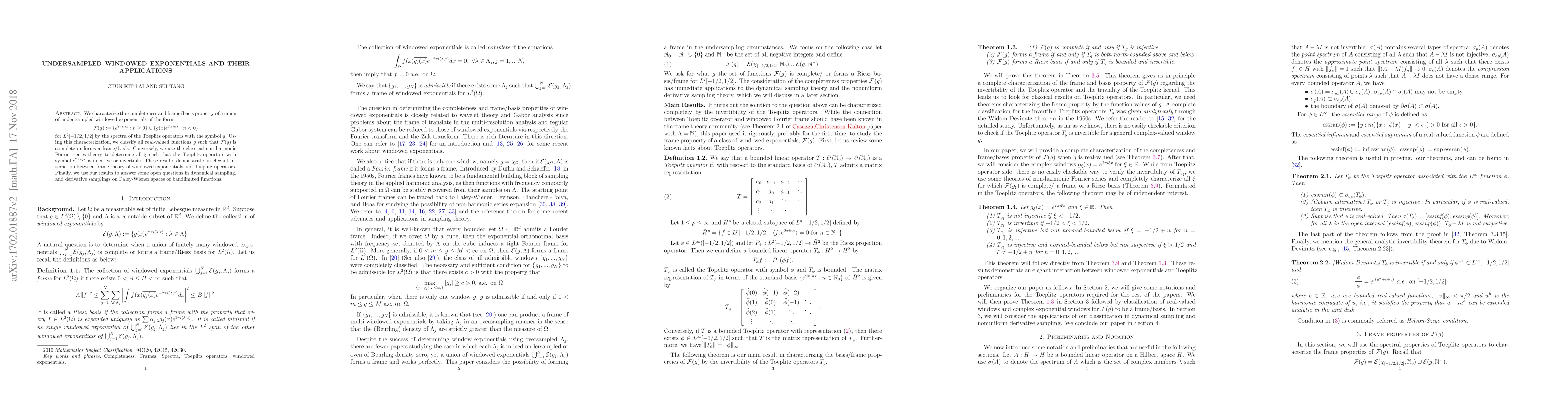 We characterize the completeness and frame/basis property of a union of under-sampled windowed exponentials of the form $$ {\mathcal F}(g): =\{e^{2\pi i n x}: n\ge 0\}\cup \{g(x)e^{2\pi i nx}: n<0\} $$ for $L^2[-1/2,1/2]$ by the spectra of the Toeplitz operators with symbol $g$. Using this characterization, we classify all real-valued functions $g$ such that ${\mathcal F}(g)$ is complete or forms a frame/basis. Conversely, we use the classical Kadec-1/4-theorem in non-harmonic Fourier series to determine all $\xi$ such that the Toeplitz operators with symbol $e^{2\pi i \xi x}$ is injective or invertible. These results demonstrate an elegant interaction between frame theory of windowed exponentials and Toeplitz operators. Finally, as an application, we use our results to answer some open questions in dynamical sampling, phase retrieval and derivative samplings on $\ell^2({\mathbb Z})$ and Paley-Wiener spaces of bandlimited functions.