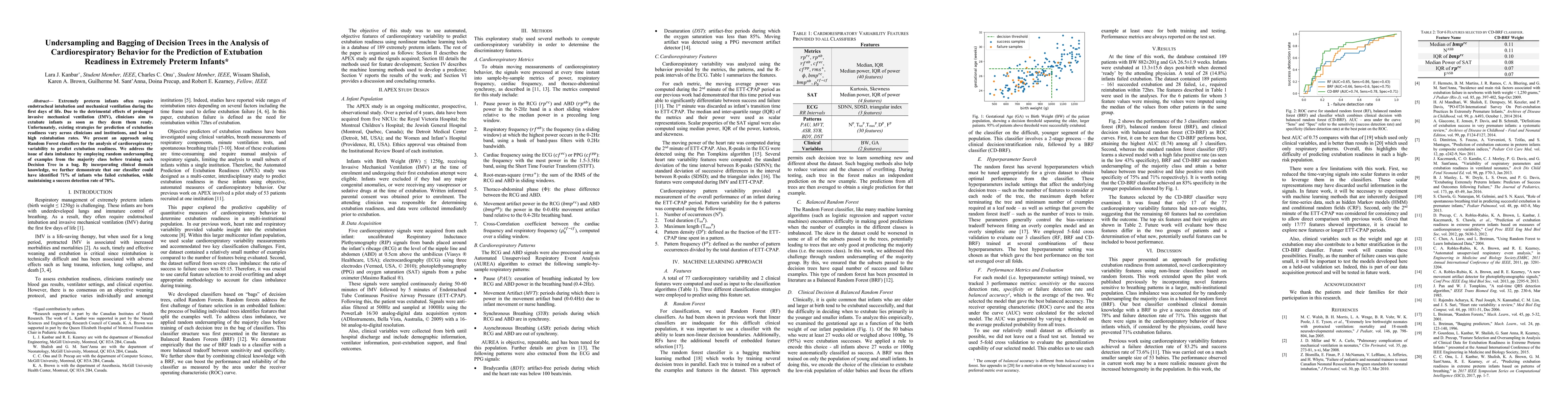This paper proposes a Random Forest classifier using undersampling and bagging of Decision Trees to predict extubation readiness in extremely preterm infants. The method addresses data imbalance and achieves a 71% identification rate for infants who failed extubation, with a 78% success detection rate.