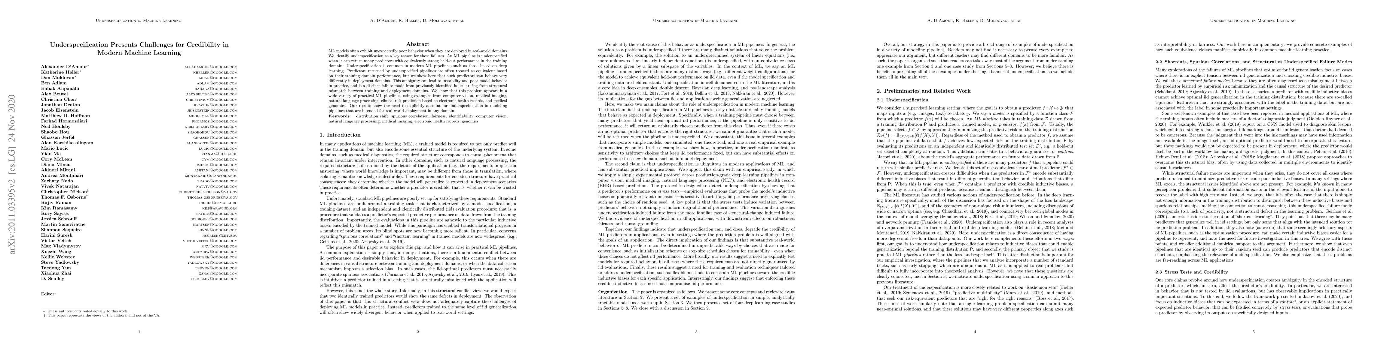 This paper identifies underspecification in machine learning models as a significant cause of poor real-world performance, where multiple predictors with similar training success can behave differently in deployment. The study highlights the need for explicit consideration of underspecification to improve model credibility in practical applications.