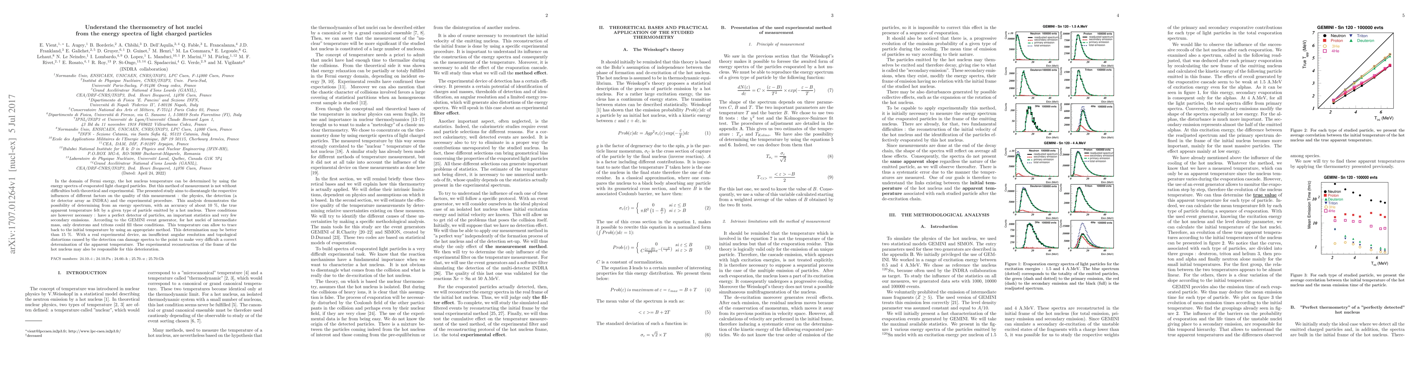 In the domain of Fermi energy, the hot nucleus temperature can be determined by using the energy spectra of evaporated light charged particles. But this method of measurement is not without difficulties both theoretical and experimental. The presented study aims to disentangle the respective influences of different factors on the quality of this measurement : the physics, the detection (a 4? detector array as INDRA) and the experimental procedure. This analysis demonstrates the possibility of determining from an energy spectrum, with an accuracy of about 10 %, the true apparent temperature felt by a given type of particle emitted by a hot nucleus. Three conditions are however necessary : have a perfect detector of particles, an important statistics and very few secondary emissions. According to the GEMINI event generator, for hot nuclei of intermediate mass, only deuterons and tritons could fill these conditions. This temperature can allow to trace back to the initial temperature by using an appropriate method. This determination may be better than 15 %. With a real experimental device, an insufficient angular resolution and topological distortions caused by the detection can damage spectra to the point to make very difficult a correct determination of the apparent temperature. The experimental reconstruction of the frame of the hot nucleus may also be responsible for this deterioration