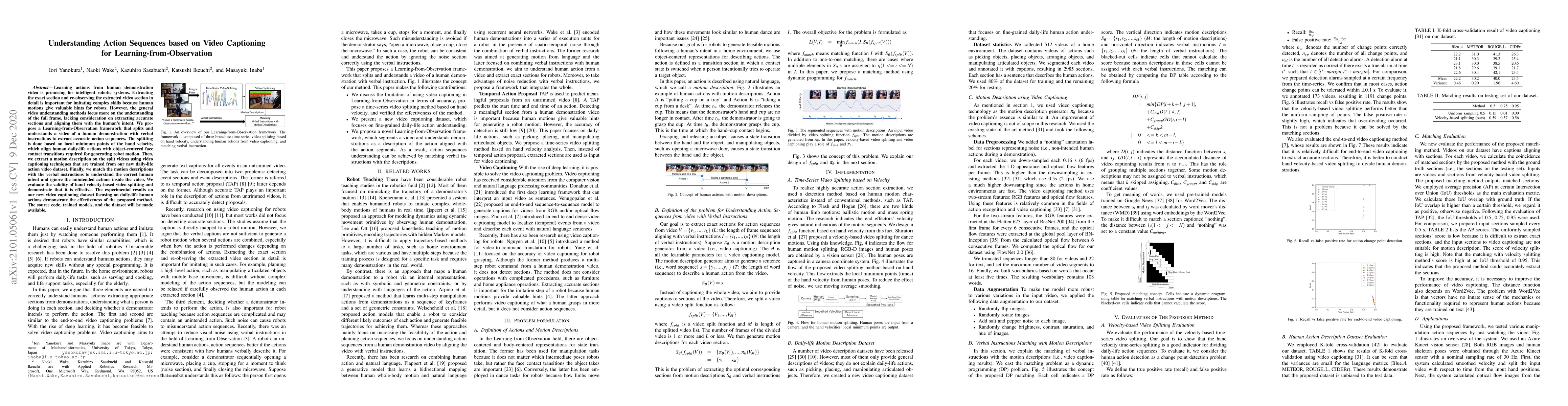 This paper proposes a Learning-from-Observation framework to extract precise action sequences from human demonstration videos using video captioning and hand velocity analysis. The method splits videos based on hand velocity minima to align with human actions and object interactions, then uses a new daily-life action video dataset to train captioning models for accurate motion descriptions.