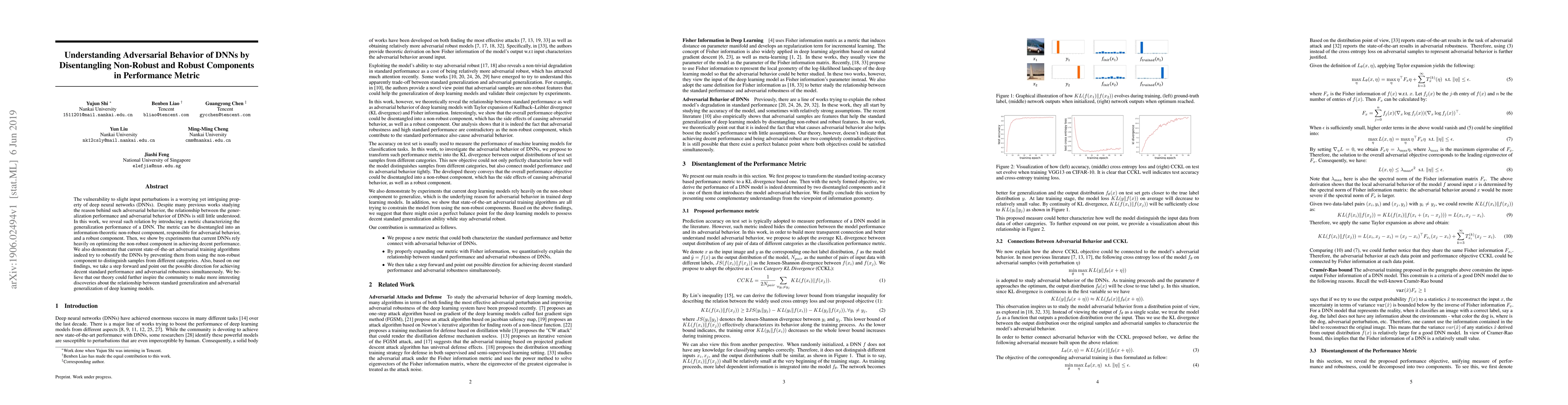 The vulnerability to slight input perturbations is a worrying yet intriguing property of deep neural networks (DNNs). Despite many previous works studying the reason behind such adversarial behavior, the relationship between the generalization performance and adversarial behavior of DNNs is still little understood. In this work, we reveal such relation by introducing a metric characterizing the generalization performance of a DNN. The metric can be disentangled into an information-theoretic non-robust component, responsible for adversarial behavior, and a robust component. Then, we show by experiments that current DNNs rely heavily on optimizing the non-robust component in achieving decent performance. We also demonstrate that current state-of-the-art adversarial training algorithms indeed try to robustify the DNNs by preventing them from using the non-robust component to distinguish samples from different categories. Also, based on our findings, we take a step forward and point out the possible direction for achieving decent standard performance and adversarial robustness simultaneously. We believe that our theory could further inspire the community to make more interesting discoveries about the relationship between standard generalization and adversarial generalization of deep learning models.