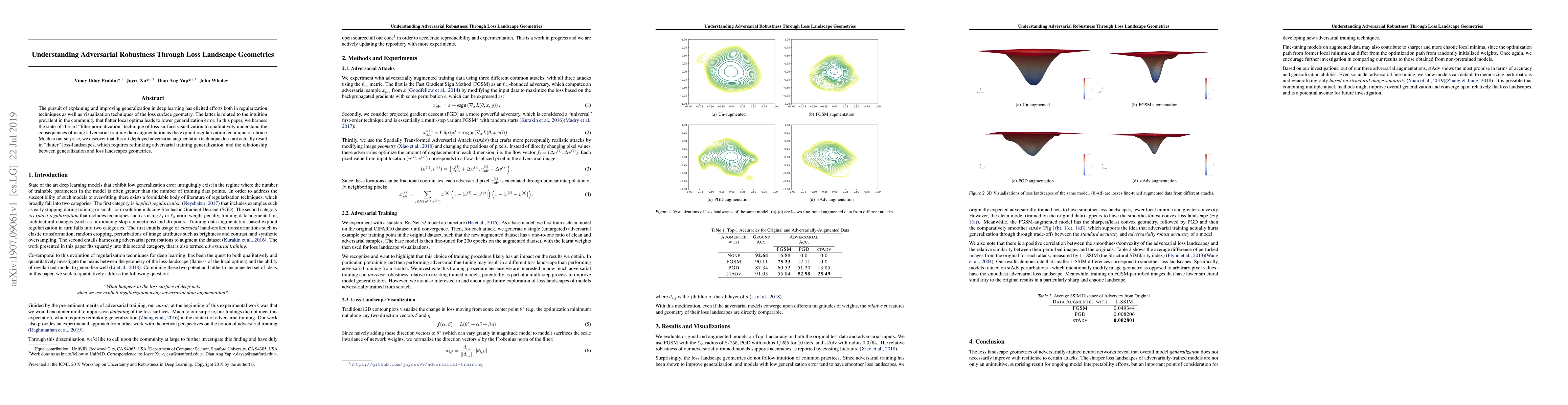 This paper explores how adversarial training influences loss landscape geometries using "filter normalization." Contrary to the prevailing belief, adversarial augmentation does not lead to flatter local optima, challenging existing assumptions about adversarial training's impact on generalization.