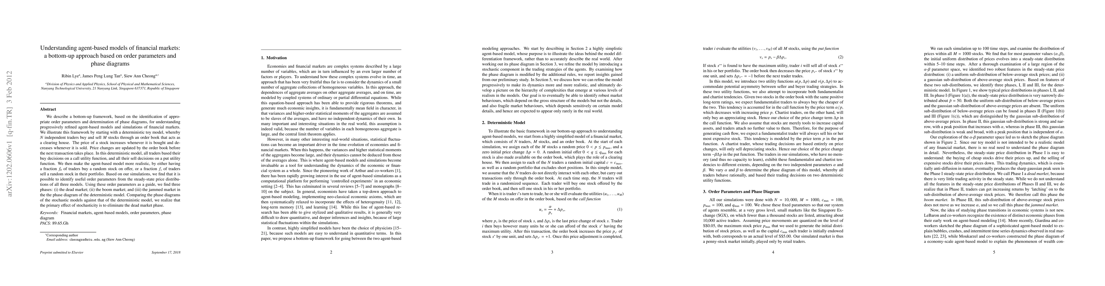 We describe a bottom-up framework, based on the identification of appropriate order parameters and determination of phase diagrams, for understanding progressively refined agent-based models and simulations of financial markets. We illustrate this framework by starting with a deterministic toy model, whereby $N$ independent traders buy and sell $M$ stocks through an order book that acts as a clearing house. The price of a stock increases whenever it is bought and decreases whenever it is sold. Price changes are updated by the order book before the next transaction takes place. In this deterministic model, all traders based their buy decisions on a call utility function, and all their sell decisions on a put utility function. We then make the agent-based model more realistic, by either having a fraction $f_b$ of traders buy a random stock on offer, or a fraction $f_s$ of traders sell a random stock in their portfolio. Based on our simulations, we find that it is possible to identify useful order parameters from the steady-state price distributions of all three models. Using these order parameters as a guide, we find three phases: (i) the dead market; (ii) the boom market; and (iii) the jammed market in the the phase diagram of the deterministic model. Comparing the phase diagrams of the stochastic models against that of the deterministic model, we realize that the primary effect of stochasticity is to eliminate the dead market phase.