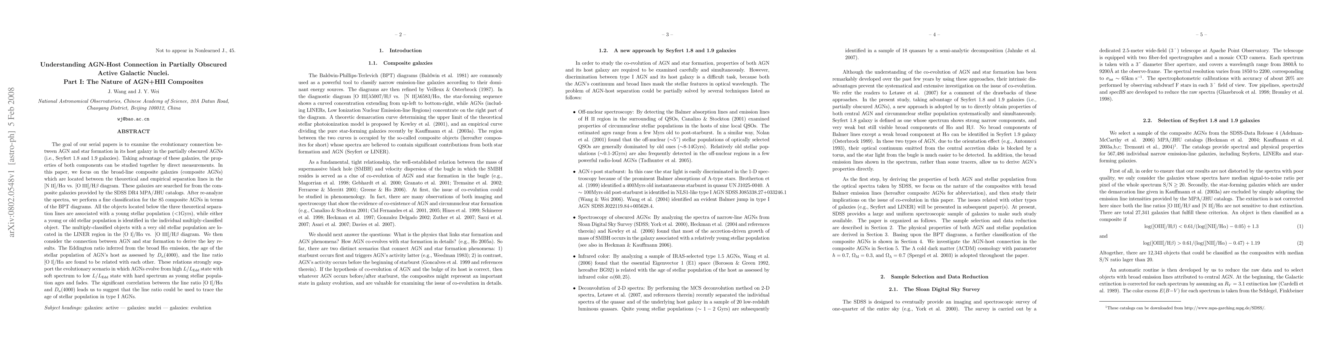 The goal of our serial papers is to examine the evolutionary connection between AGN and star formation in its host galaxy in the partially obscured AGNs (i.e., Seyfert 1.8 and 1.9 galaxies). Taking advantage of these galaxies, the properties of both components can be studied together by direct measurements. In this paper, we focus on the broad-line composite galaxies (composite AGNs) which are located between the theoretical and empirical separation lines in the [NII]/Ha vs. [OIII]/Hb diagram. These galaxies are searched for from the composite galaxies provided by the SDSS DR4 MPA/JHU catalogs. After re-analyze the spectra, we perform a fine classification for the 85 composite AGNs in terms of the BPT diagrams. All the objects located below the three theoretical separation lines are associated with a young stellar population (<1Gyrs), while either a young or old stellar population is identified in the individual multiply-classified object. The multiply-classified objects with a very old stellar population are located in the LINER region in the [OI]/Ha vs. [OIII]/Hb diagram. We then consider the connection between AGN and star formation to derive the key results. The Eddington ratio inferred from the broad Ha emission, the age of the stellar population of AGN's host as assessed by D_n(4000), and the line ratio [OI]/Ha are found to be related with each other. These relations strongly support the evolutionary scenario in which AGNs evolve from high L/L_Edd state with soft spectrum to low L/L_Edd state with hard spectrum as young stellar population ages and fades. The significant correlation between the line ratio [OI]/Ha and D_n(4000) leads us to suggest that the line ratio could be used to trace the age of stellar population in type I AGNs.