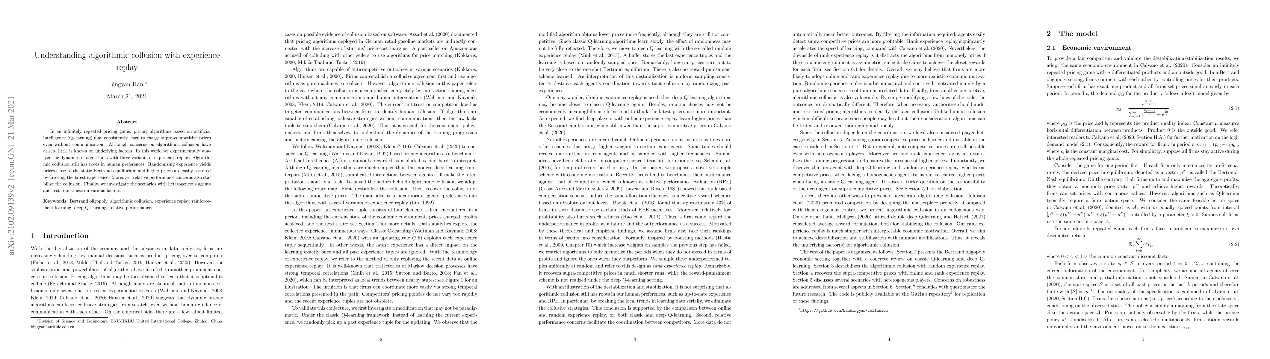 This paper explores how algorithmic collusion in AI-driven pricing algorithms can emerge through experience replay in an infinitely repeated pricing game. It finds that randomizing experience can lead to competitive pricing, but favoring recent experiences can restore supra-competitive prices, highlighting the influence of human-like preferences and performance concerns in algorithmic collusion dynamics.