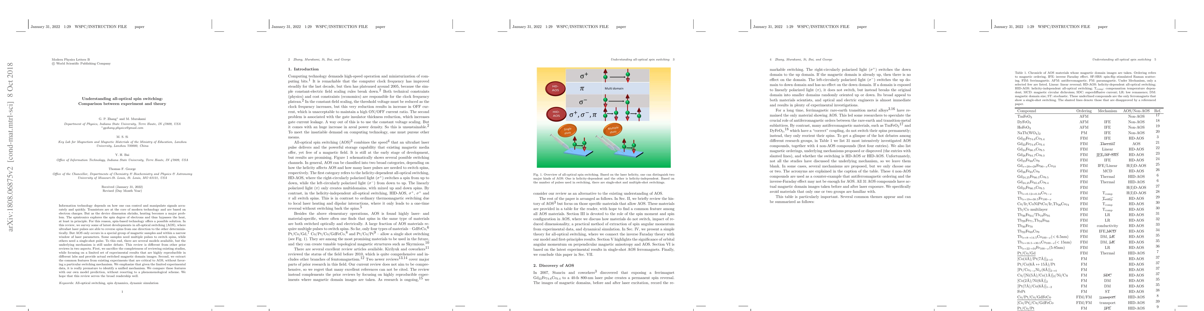 Information technology depends on how one can control and manipulate signals accurately and quickly. Transistors are at the core of modern technology and are based on electron charges. But as the device dimension shrinks, heating becomes a major problem. The spintronics explores the spin degree of electrons and thus bypasses the heat, at least in principle. For this reason, spin-based technology offers a possible solution. In this review, we survey some of latest developments in all-optical switching (AOS), where ultrafast laser pulses are able to reverse spins from one direction to the other deterministically. But AOS only occurs in a special group of magnetic samples and within a narrow window of laser parameters. Some samples need multiple pulses to switch spins, while others need a single-shot pulse. To this end, there are several models available, but the underlying mechanism is still under debate. This review is different from other prior reviews in two aspects. First, we sacrifice the completeness of reviewing existing studies, while focusing on a limited set of experimental results that are highly reproducible in different labs and provide actual switched magnetic domain images. Second, we extract the common features from existing experiments that are critical to AOS, without favoring a particular switching mechanism. We emphasize that given the limited experimental data, it is really premature to identify a unified mechanism. We compare these features with our own model prediction, without resorting to a phenomenological scheme. We hope that this review serves the broad readership well.