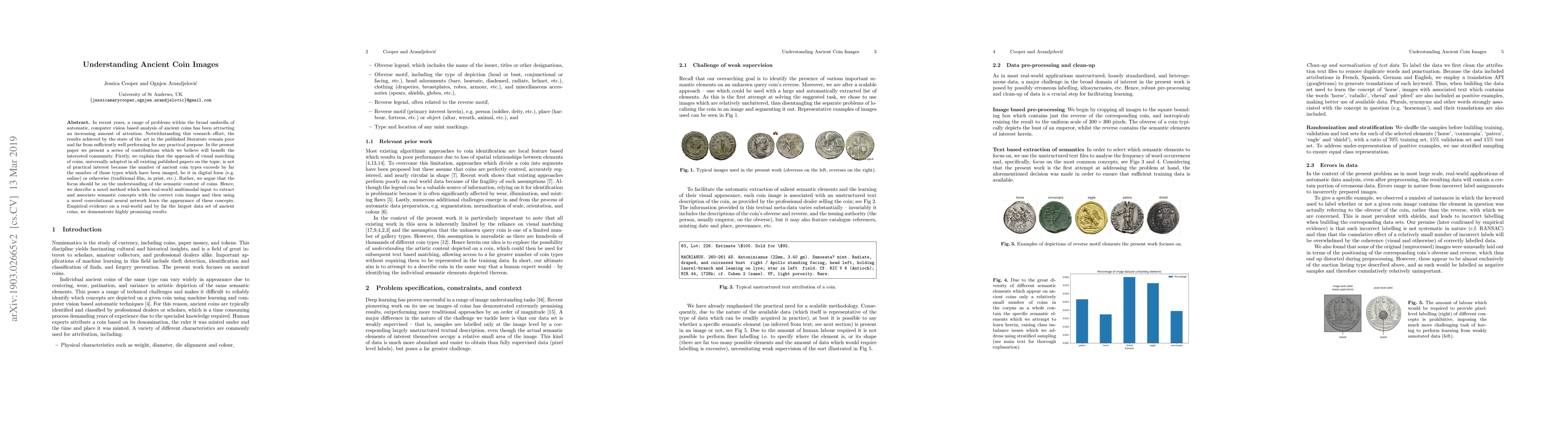 This paper critiques the existing methods for analyzing ancient coins via computer vision, arguing that visual matching is impractical due to the vast number of coin types. It proposes a novel approach focusing on semantic content, utilizing multimodal input to associate concepts with coin images and employing a convolutional neural network to learn these concepts, achieving promising results on a large dataset.