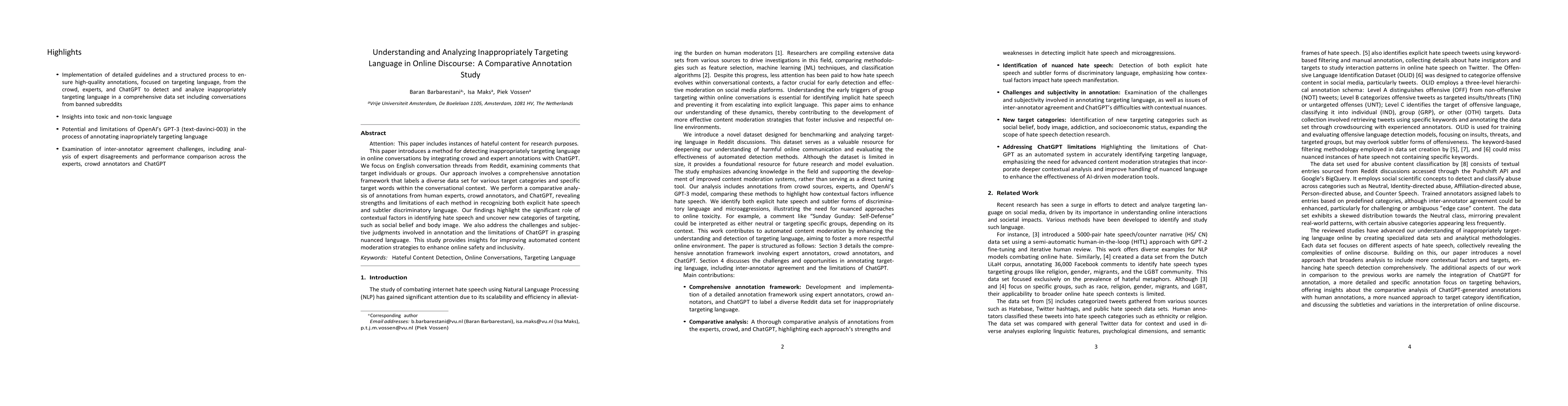 This paper introduces a method for detecting inappropriately targeting language in online conversations by integrating crowd and expert annotations with ChatGPT. We focus on English conversation threads from Reddit, examining comments that target individuals or groups. Our approach involves a comprehensive annotation framework that labels a diverse data set for various target categories and specific target words within the conversational context. We perform a comparative analysis of annotations from human experts, crowd annotators, and ChatGPT, revealing strengths and limitations of each method in recognizing both explicit hate speech and subtler discriminatory language. Our findings highlight the significant role of contextual factors in identifying hate speech and uncover new categories of targeting, such as social belief and body image. We also address the challenges and subjective judgments involved in annotation and the limitations of ChatGPT in grasping nuanced language. This study provides insights for improving automated content moderation strategies to enhance online safety and inclusivity.