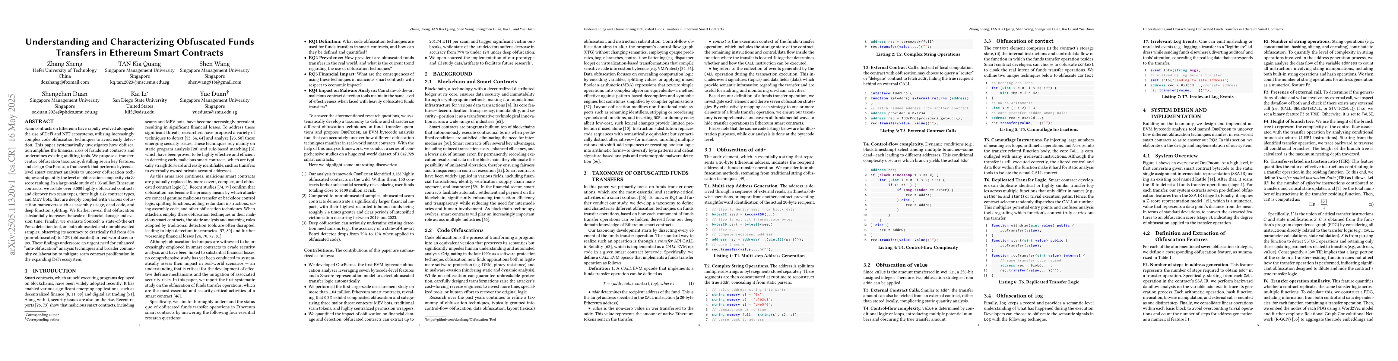 The paper systematically investigates obfuscation techniques in Ethereum smart contracts through a transfer-centric obfuscation taxonomy and a bytecode-level analysis framework called ObfProbe, employing Z-score ranking for complexity quantification.