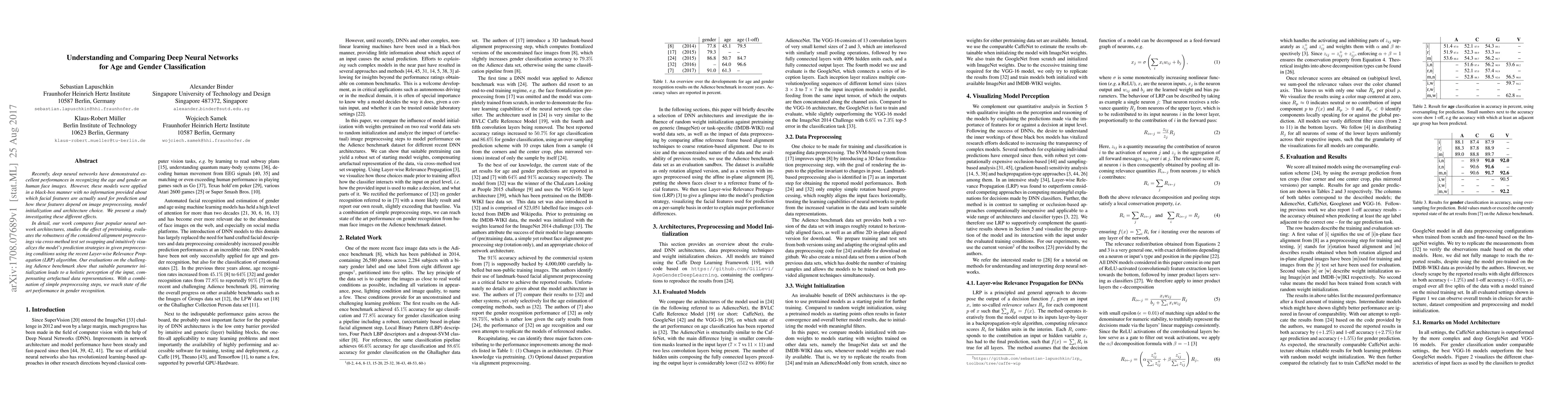 This paper investigates the performance of four popular deep neural network architectures for age and gender classification on human face images, examining the impact of preprocessing, model initialization, and architecture choice. The study employs Layer-wise Relevance Propagation to visualize prediction strategies and finds that proper initialization and simple preprocessing yield state-of-the-art gender recognition results.